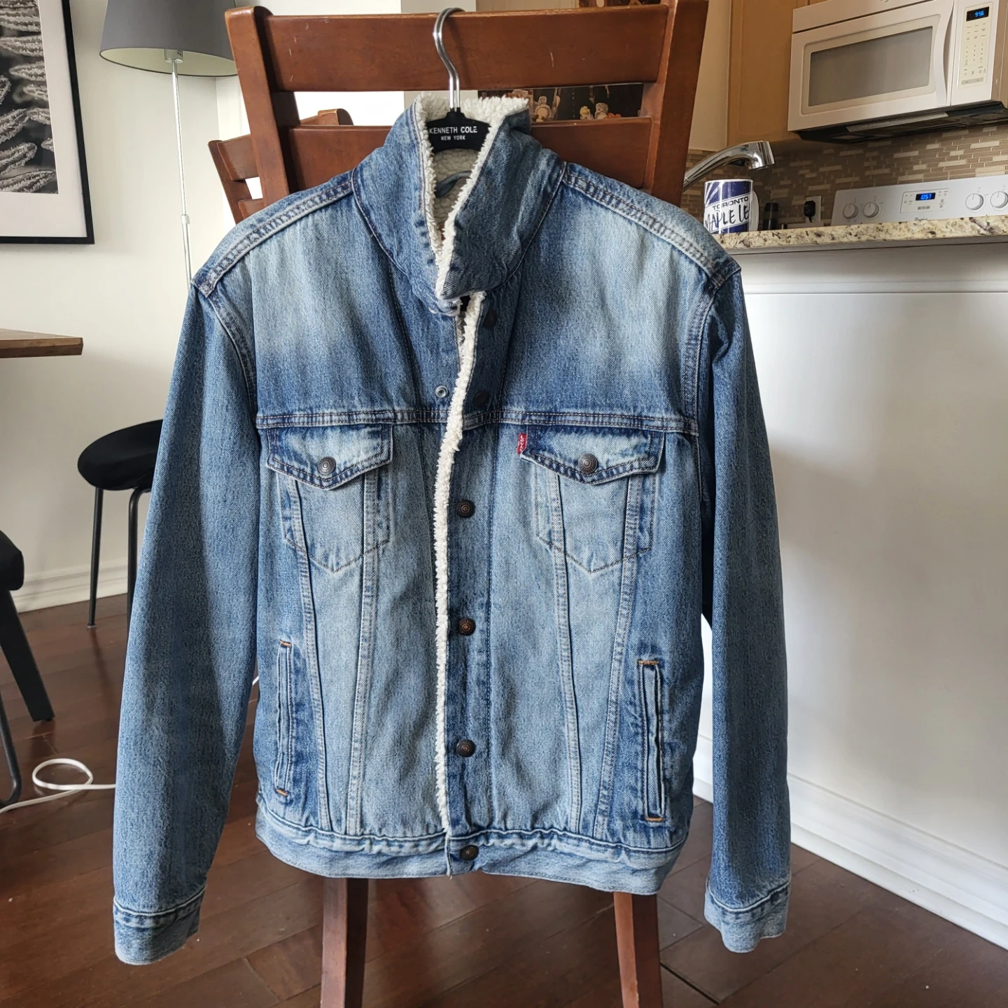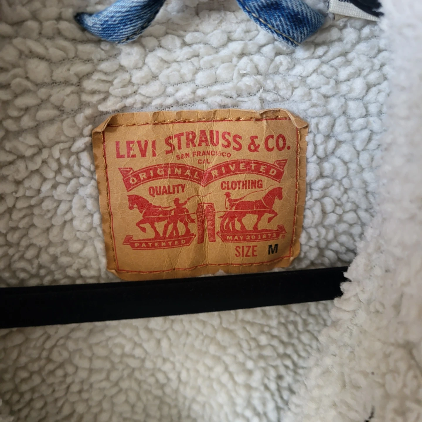 This is a Levi Strauss & Co. sherpa lined denim trucker jacket. It's a size medium with a classic blue wash. Sherpa lining provides extra warmth for cooler weather.