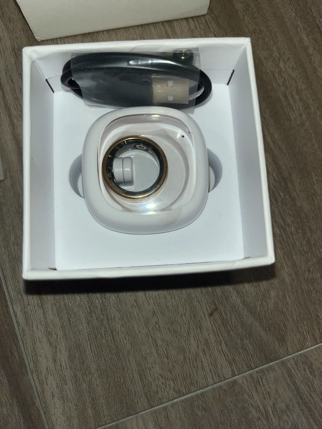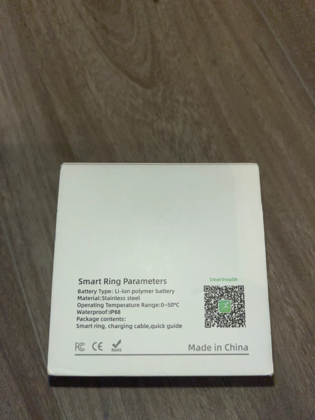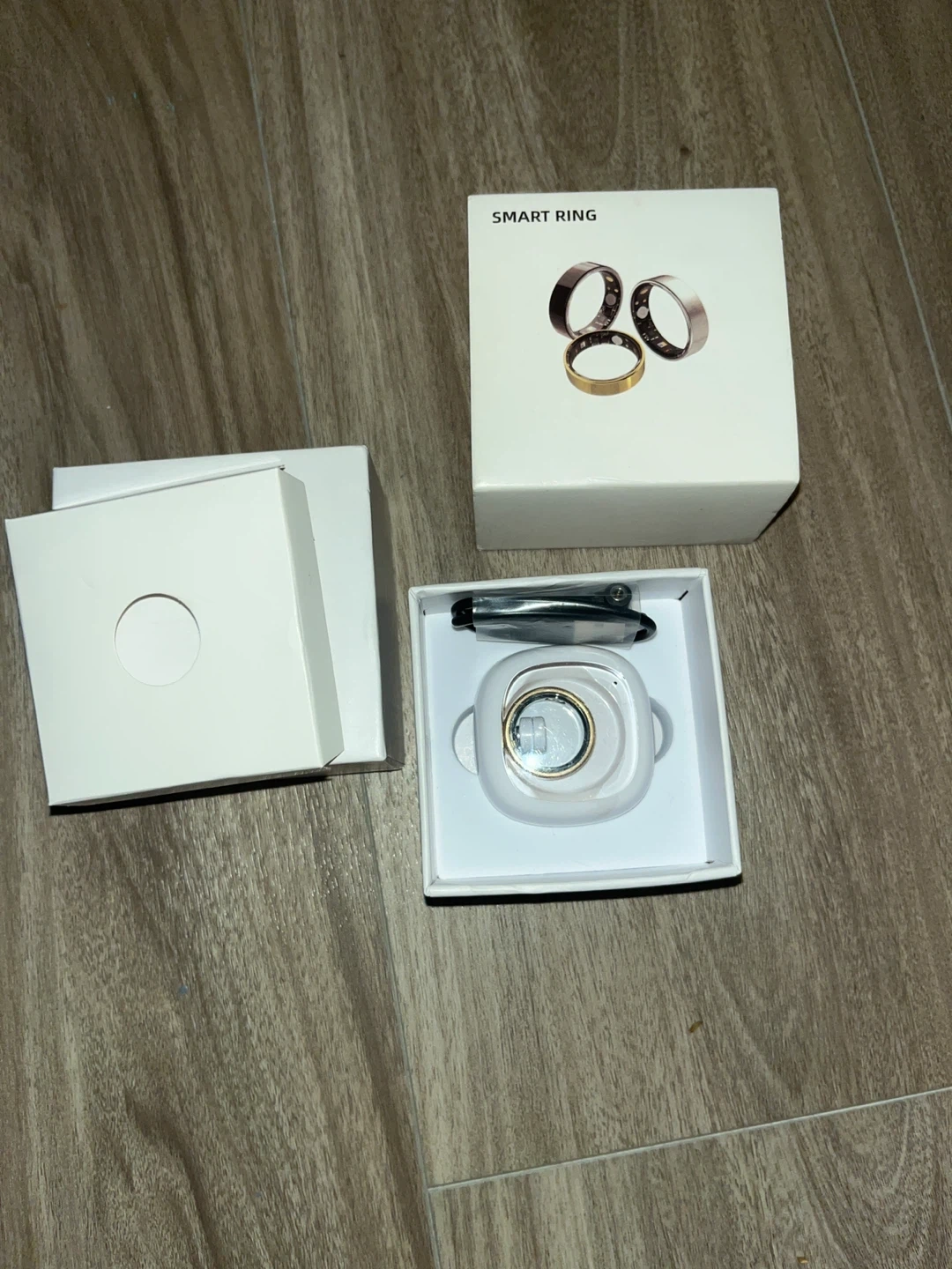 This is a Smart Ring with a Li-ion polymer battery. It's made of stainless steel and is waterproof to IP68. It comes with the smart ring, a charging cable, and a quick guide.