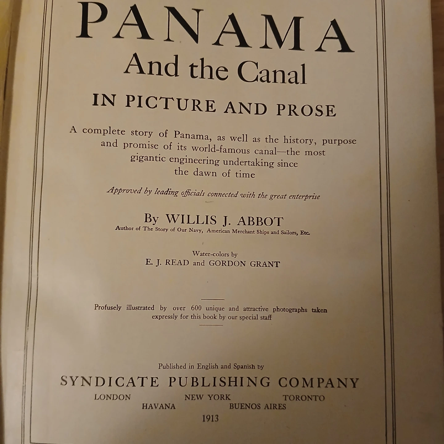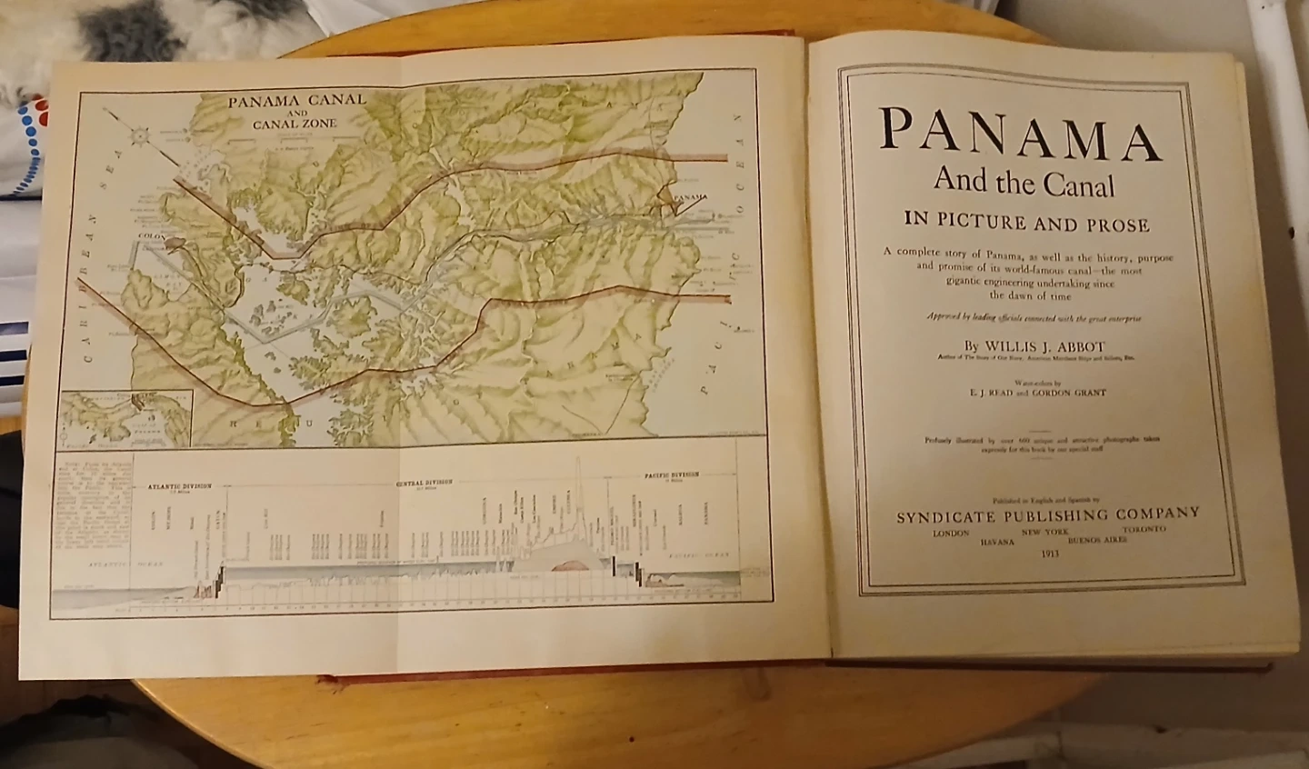Selling a vintage book titled "Panama and the Canal In Picture and Prose" by Willis J. Abbot. It's a complete story of Panama, detailing the history, purpose, and promise of the world-famous canal. The book is illustrated with over 600 unique and attractive photographs taken expressly for this book by the special staff. Published in 1913 by Syndicate Publishing Company.