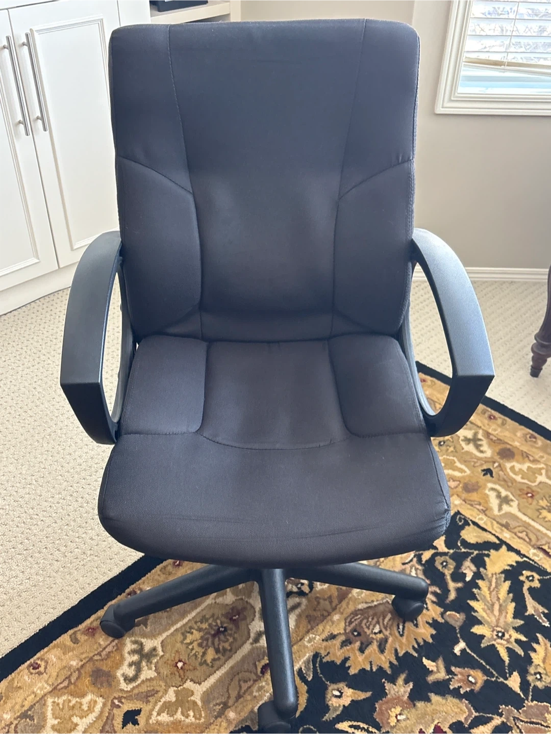 This is a black fabric office chair. It's designed for comfort with padded armrests and a supportive back. Features a rolling base for easy mobility.