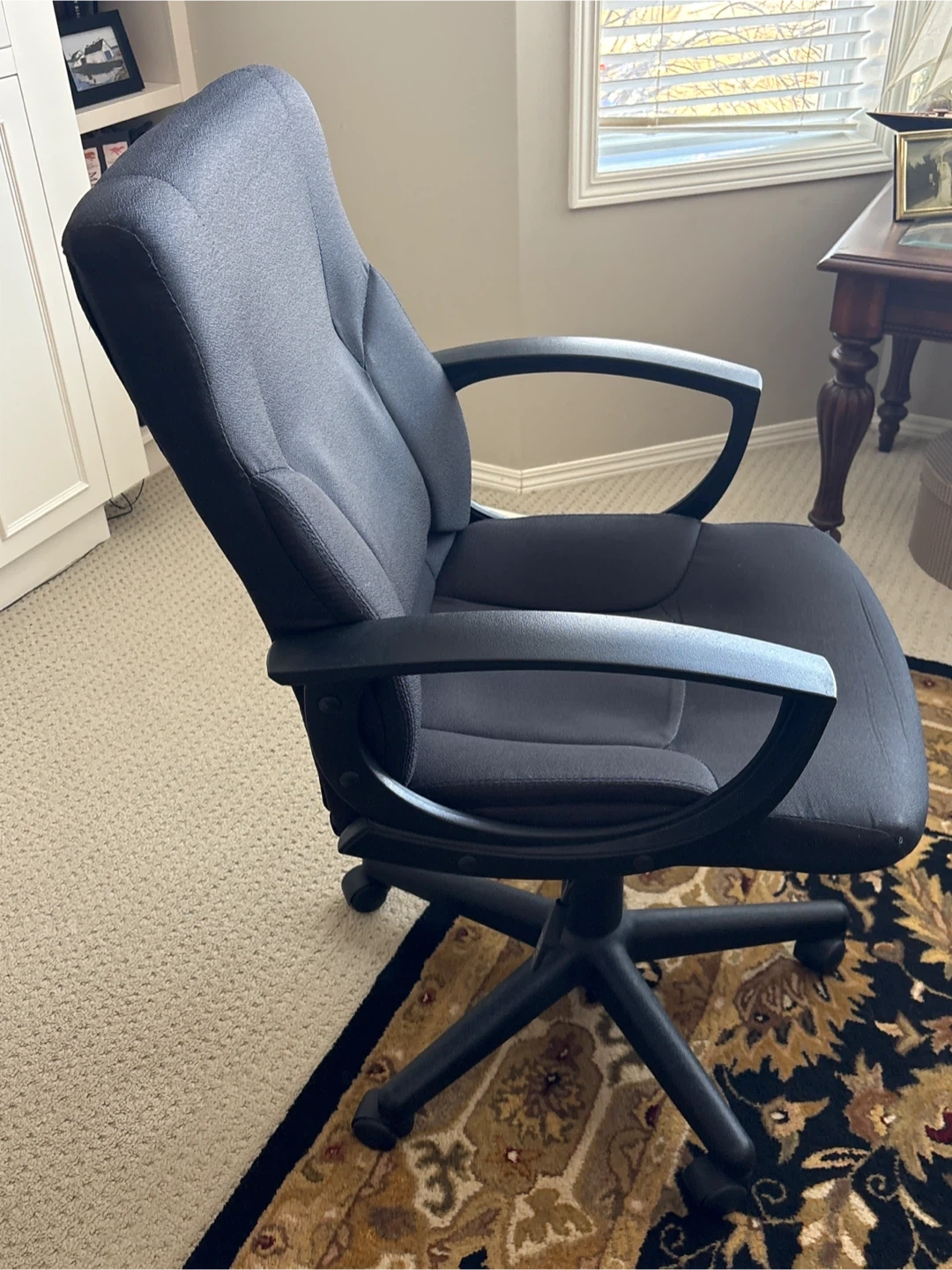 This is a black fabric office chair. It's designed for comfort with padded armrests and a supportive back. Features a rolling base for easy mobility.