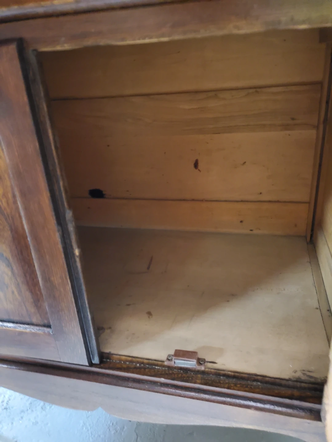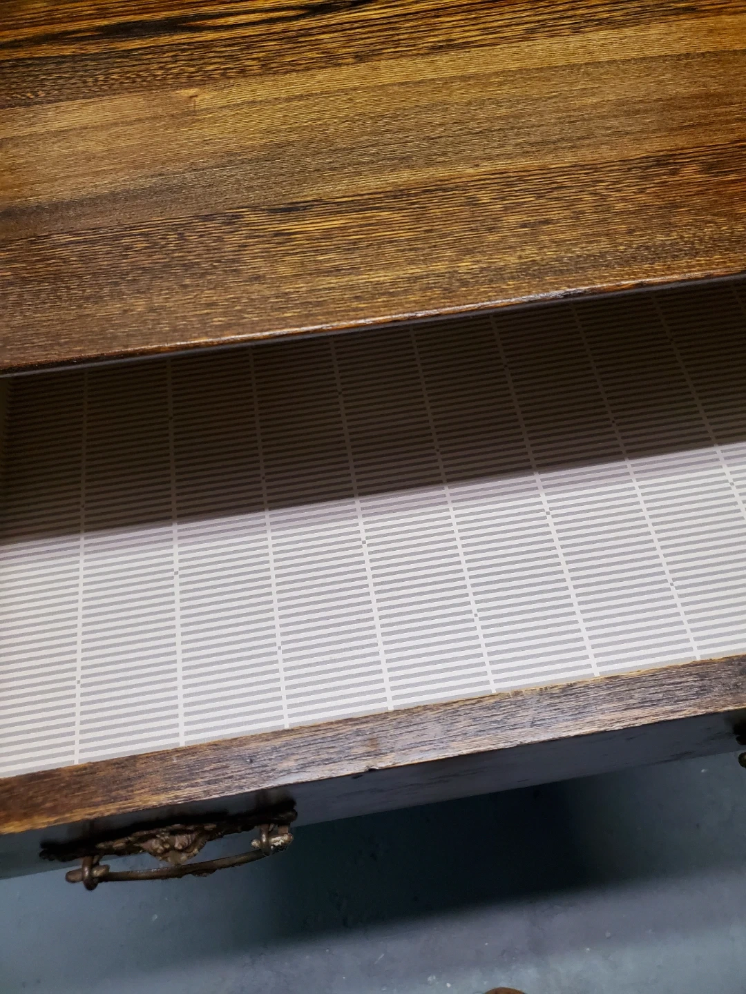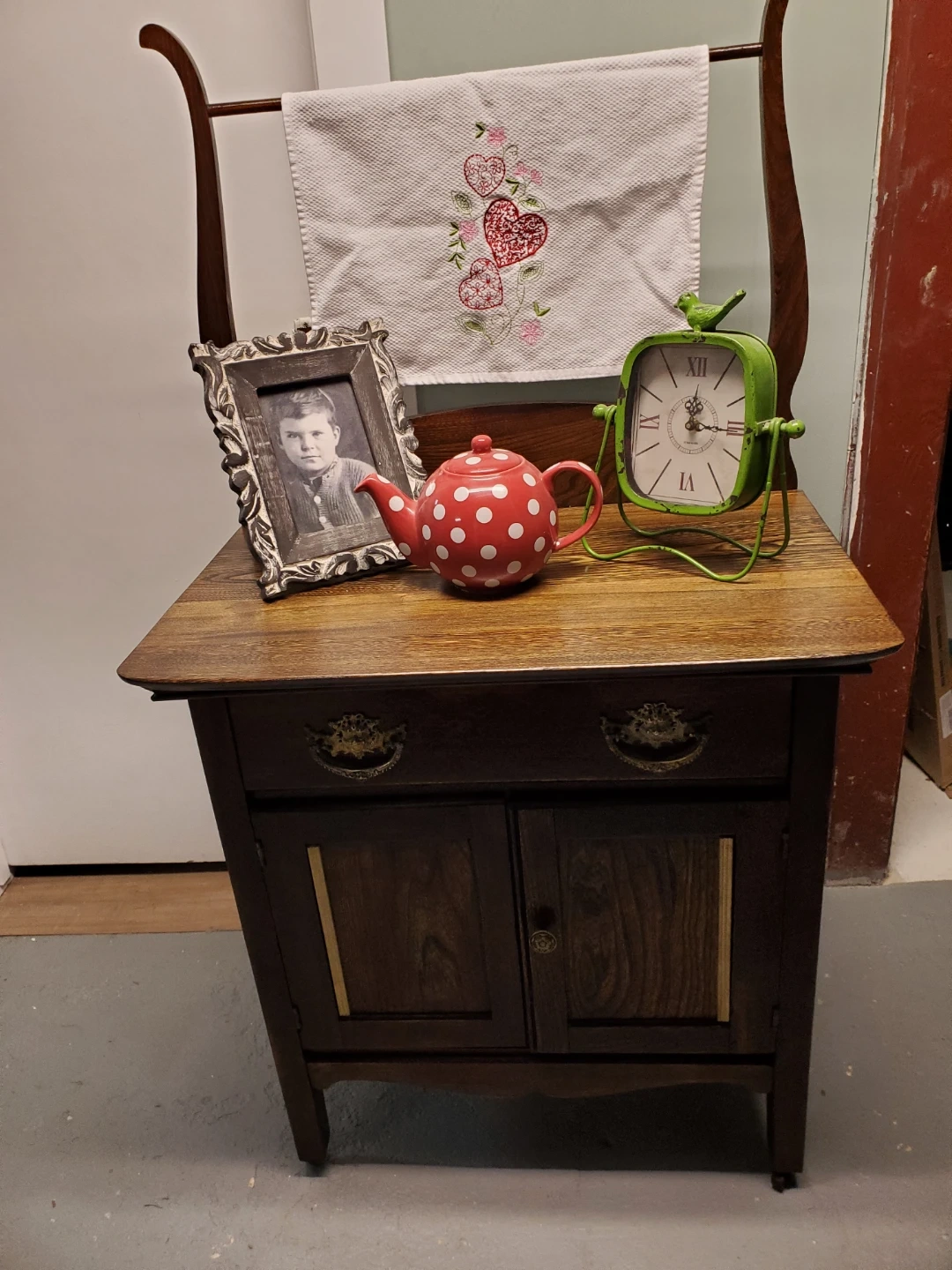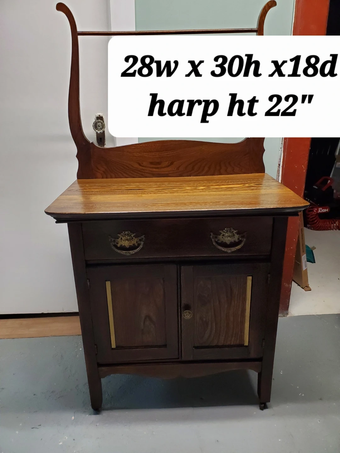 This refinished antique washstand is made of dark wood and features ornate brass drawer pulls. It measures 28 inches wide by 30 inches high, with a harp height of 22 inches. The cabinet has two doors and two drawers for storage. Would make a great coffee bar ir entryway catch all.