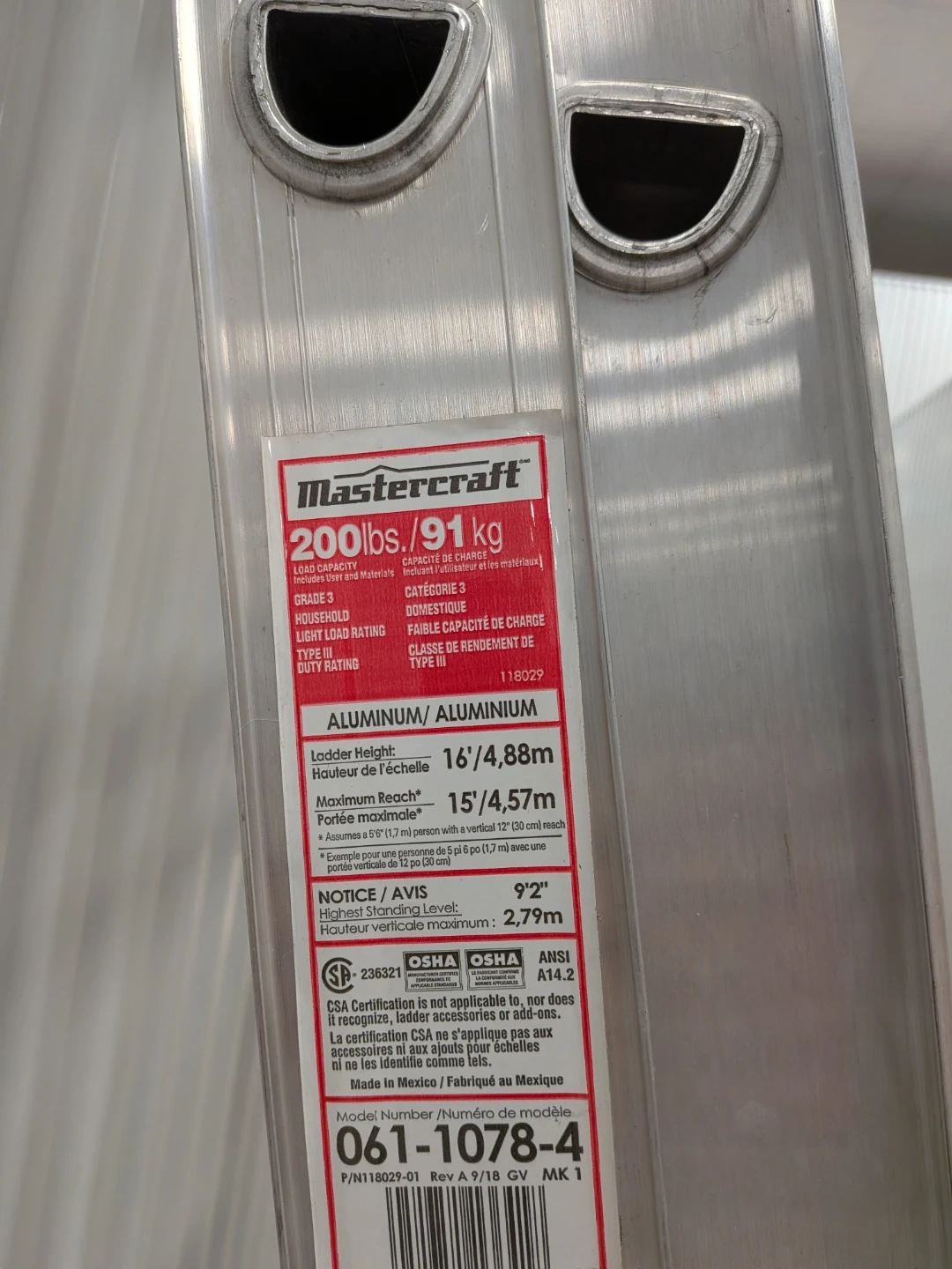 Mastercraft 16ft aluminum extension ladder. Load capacity 200 lbs / 91 kg. It's grade 3, household light load rating, type III duty rating. Maximum reach is 15ft, with a highest standing level of 9'2".