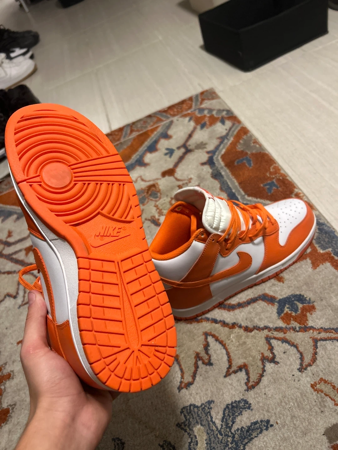 Selling a pair of Nike Dunk Highs in the Syracuse colorway, featuring a vibrant orange and white design. The shoes are a size 9 US. They are in great condition, ready for a new owner!