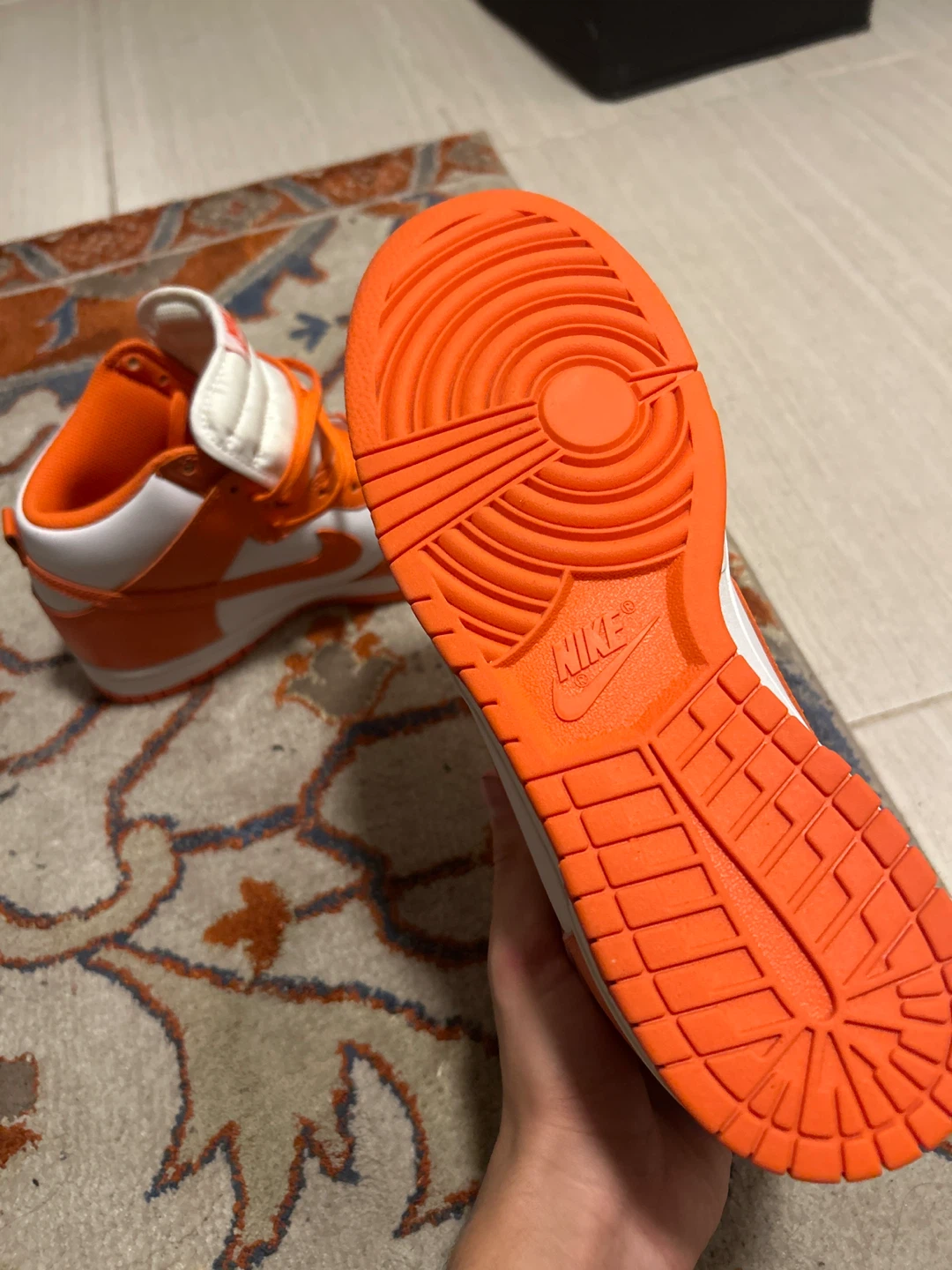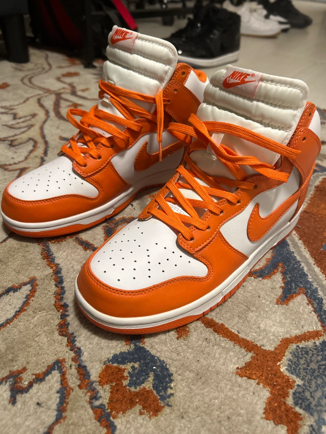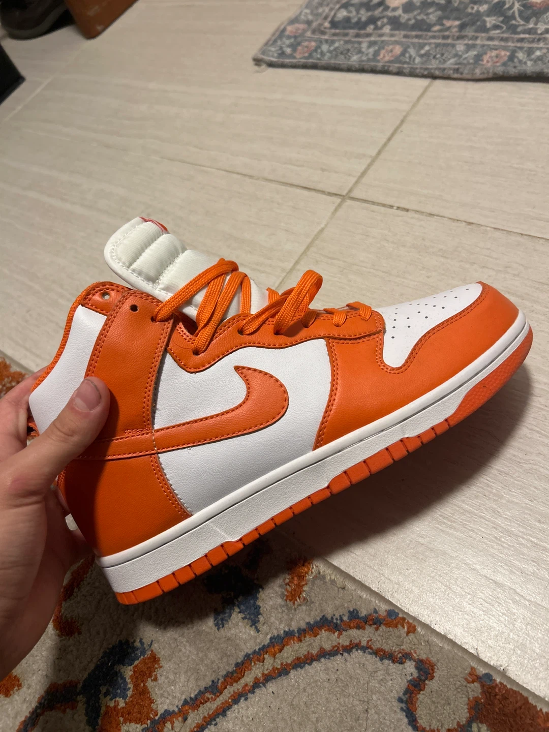 Selling a pair of Nike Dunk Highs in the Syracuse colorway, featuring a vibrant orange and white design. The shoes are a size 9 US. They are in great condition, ready for a new owner!