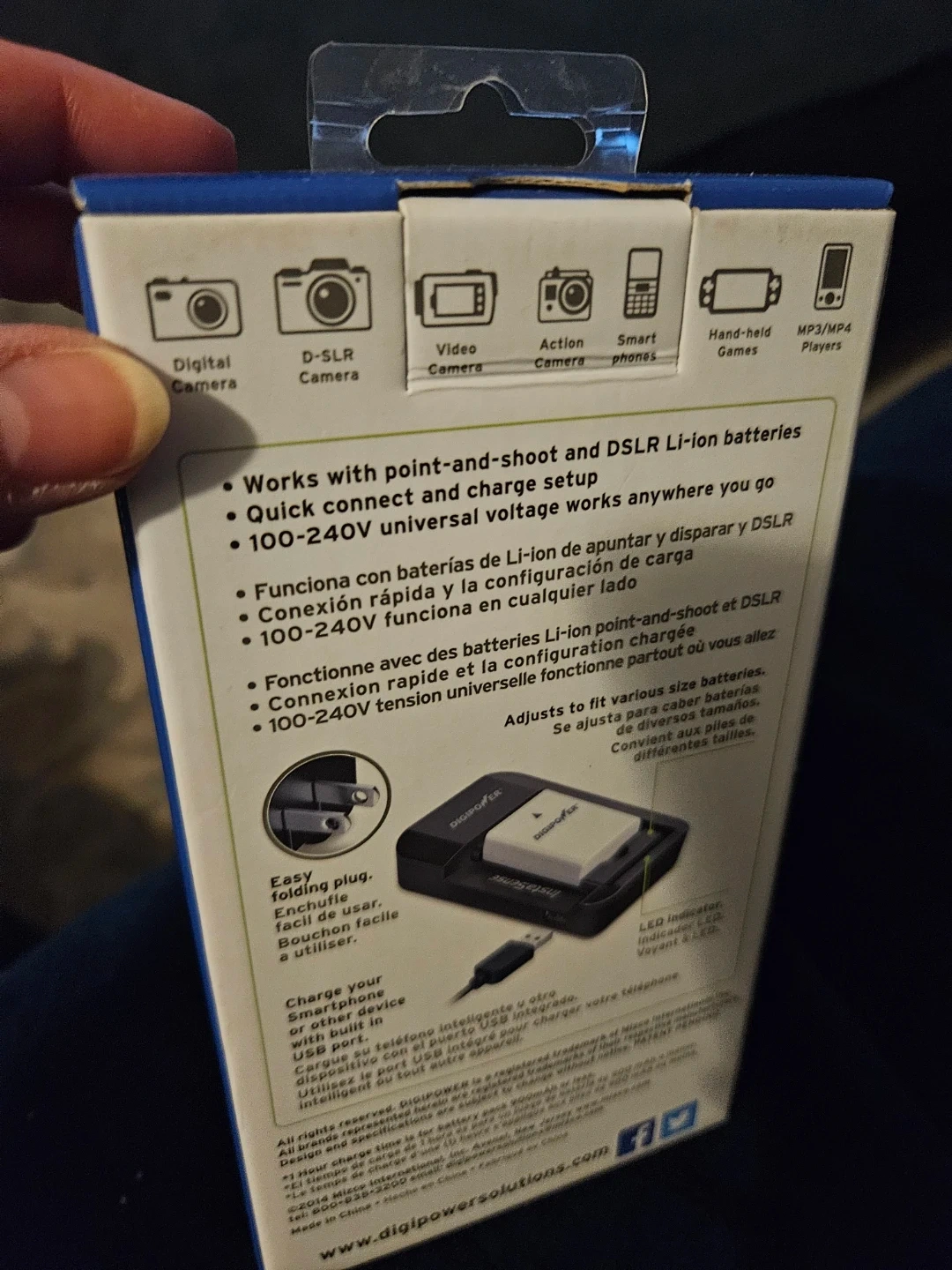 This Digipower InstaSense Smart Battery Charger provides quick connect and charge setup. It works with point-and-shoot and DSLR Li-ion batteries, offering 100-240V universal voltage. The charger features an easy folding plug design and a USB port for charging other devices.