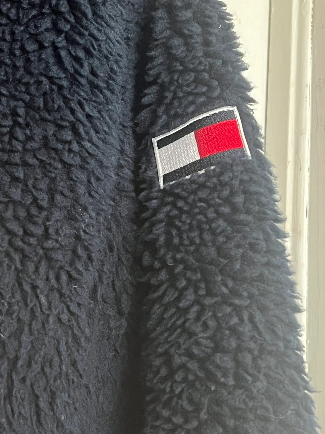Cozy Tommy Hilfiger fleece jacket in size medium! It's a black colour with a red lining and zipper. The back has a large Tommy Hilfiger flag design. Medium for Men & Large for womens.
