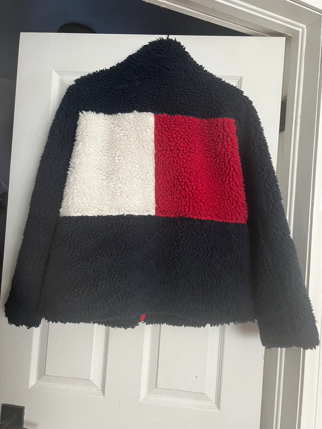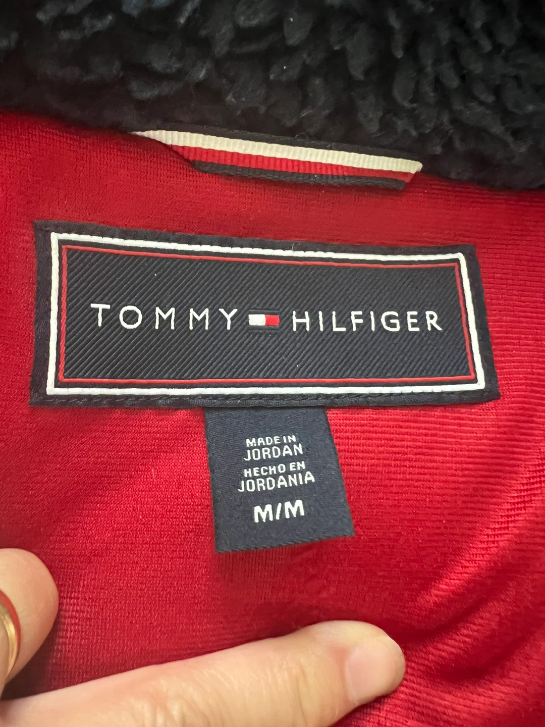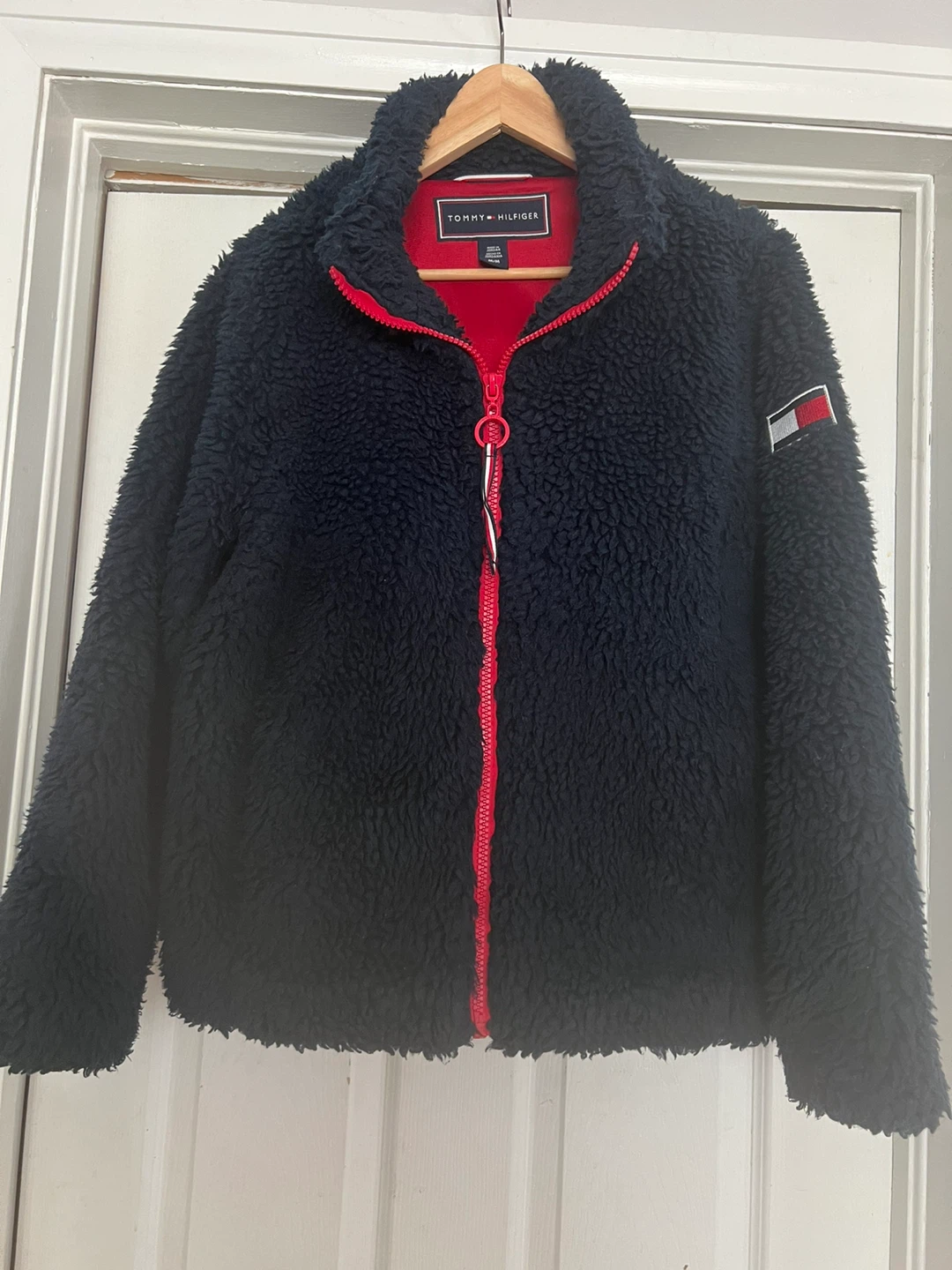 Cozy Tommy Hilfiger fleece jacket in size medium! It's a black colour with a red lining and zipper. The back has a large Tommy Hilfiger flag design. Medium for Men & Large for womens.