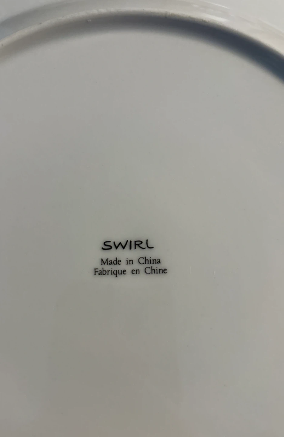 Beautiful white dinner plates with a SWIRL design (4 available). Made in China. Dishwasher safe and microwave safe. At $4 each .. all four for $15