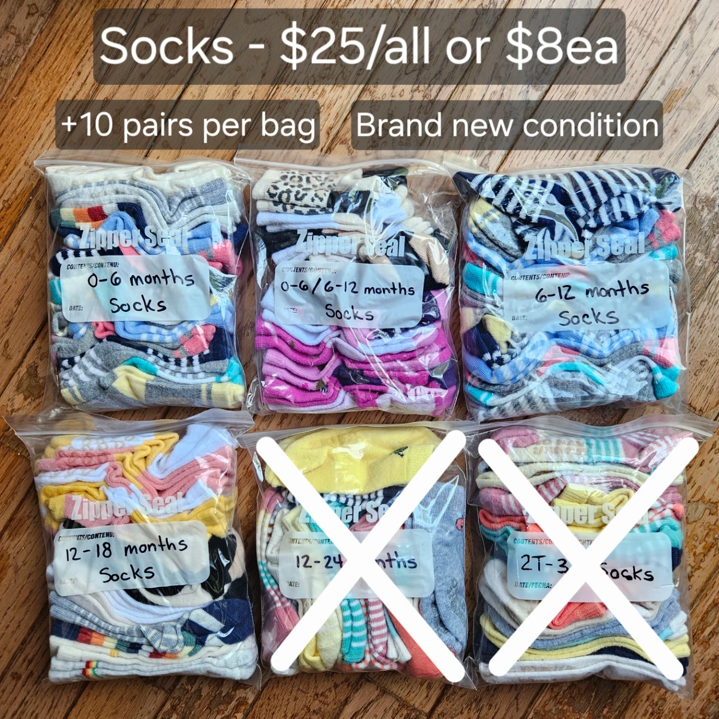 Brand new baby socks, with over 10 pairs per bag. Available in sizes 0-6 months, 6-12 months, and 12-18 months. They're perfect for keeping little feet cozy!