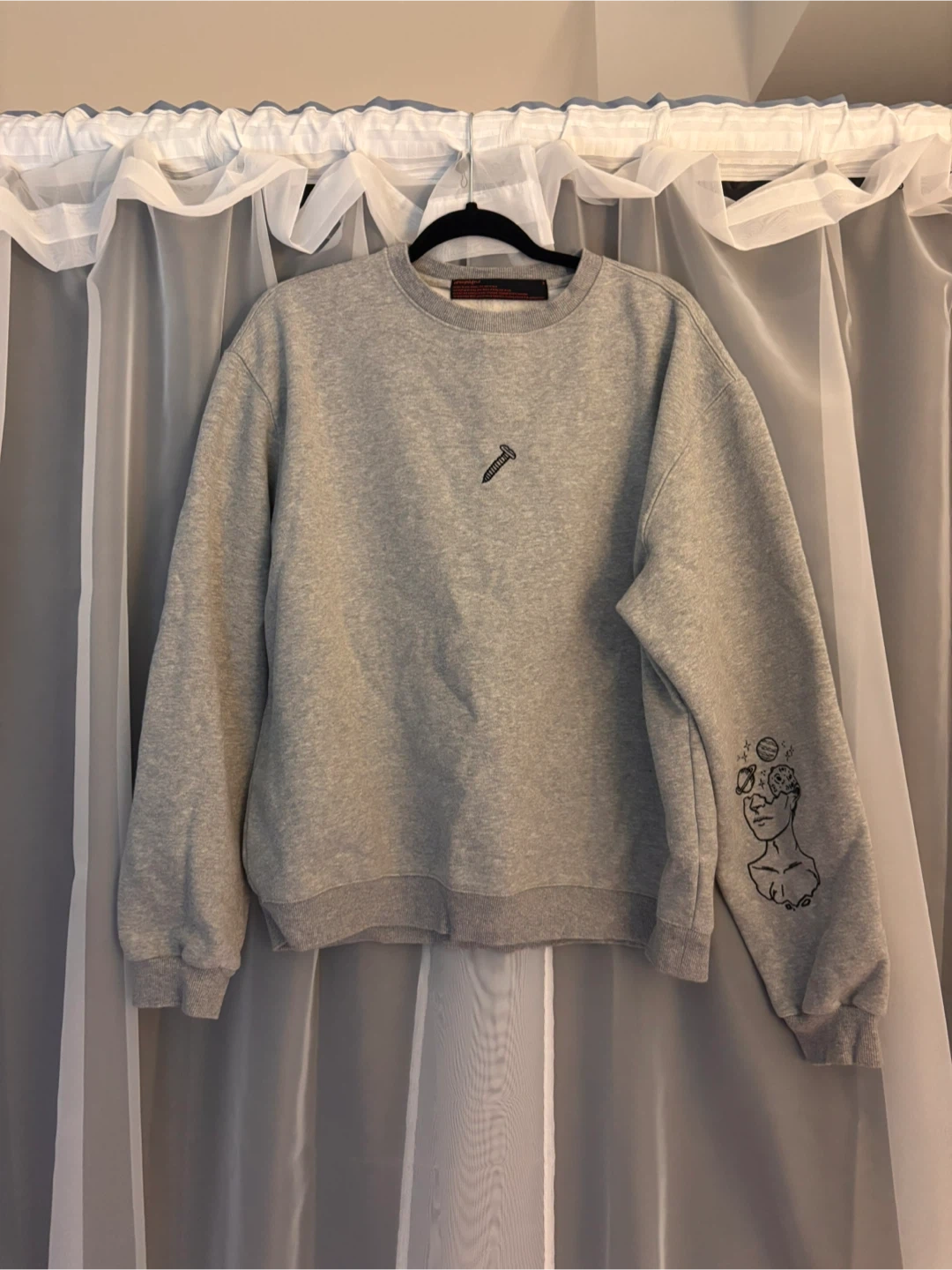 Selling a comfy grey crewneck sweatshirt! It features a unique graphic design on the front and sleeve. It's in great condition and perfect for casual wear