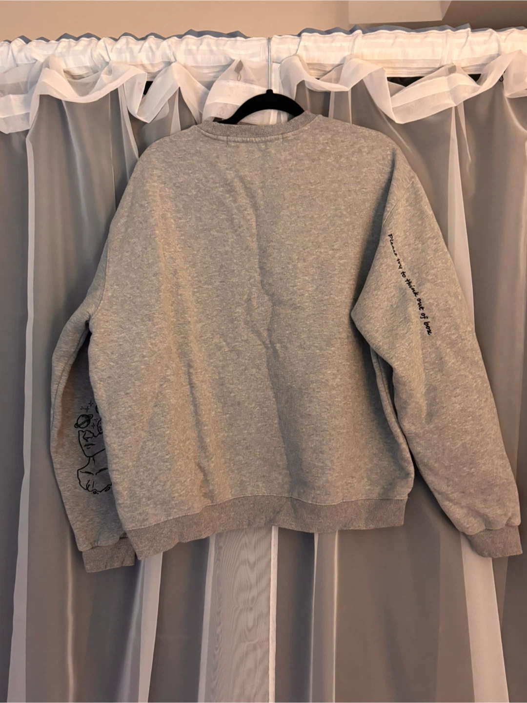 Selling a comfy grey crewneck sweatshirt! It features a unique graphic design on the front and sleeve. It's in great condition and perfect for casual wear