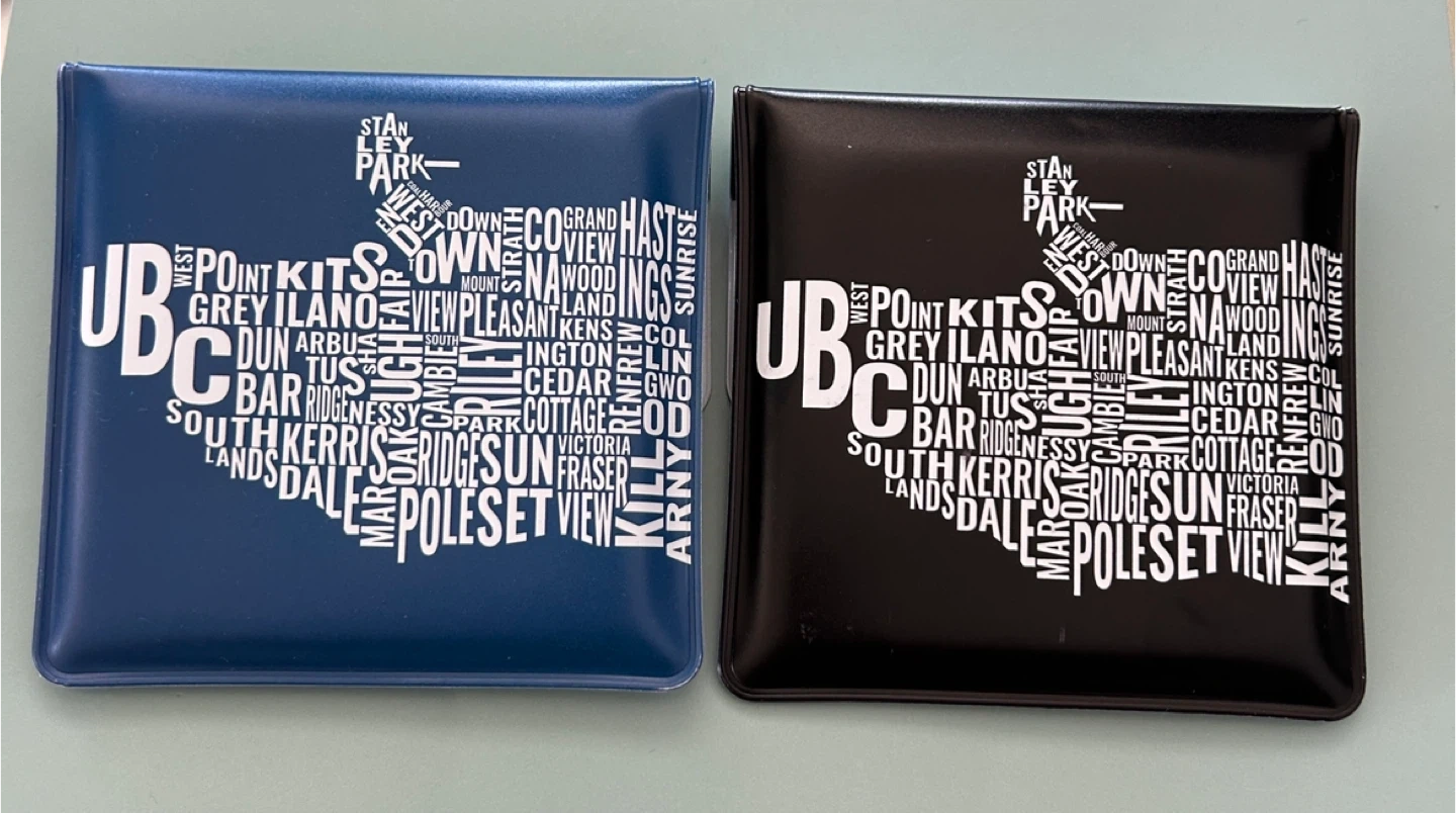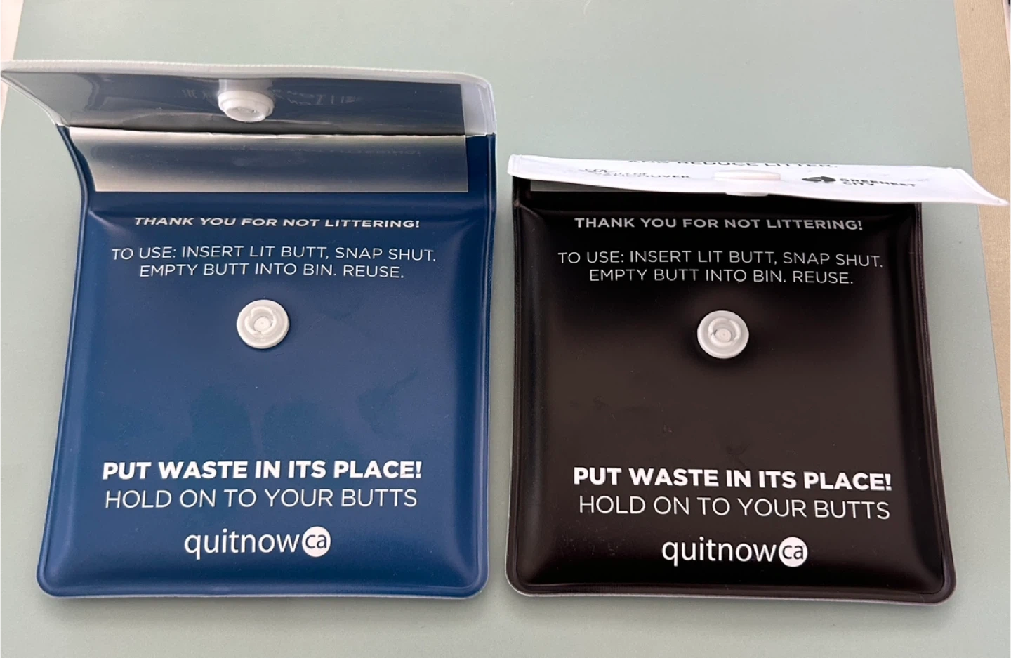 Two reusable ashtrays from QuitNow.ca, one blue and one black. They feature a map of Vancouver neighbourhoods and the UBC logo. Instructions on use and 'Thank you for not littering' messaging are printed inside. These pocket-sized ashtrays are perfect for disposing of cigarette butts responsibly when you're on the go.