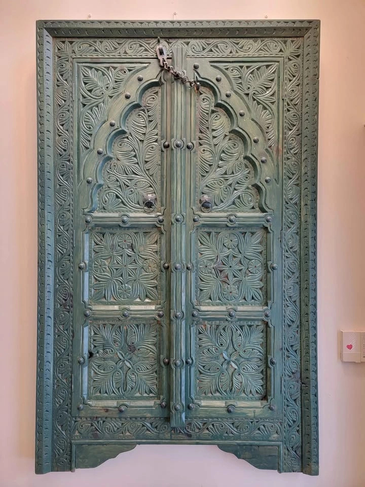 A rare and imposing architectural feature, this 5.5 feet solid wood door set is a masterclass in hand-carved artistry. Great as a decorative piece for your home, adds a vintage or bohemian vibe. Scalloped arch detailing complemented by original heavy iron chain and ring-pull hardware. Finished in a distinguished weathered verdigris, it is designed to serve as the definitive focal point of a luxury interior. Standing at almost 6 feet, it commands attention in high-ceiling spaces or grand foyers. Dimensions: Height: 66", Width: 41". Due to the substantial weight and solid wood construction, this piece requires at least two people for moving. A full-size van or pickup truck is necessary for transport. Please bring furniture blankets or padding to protect the carved relief during transit.