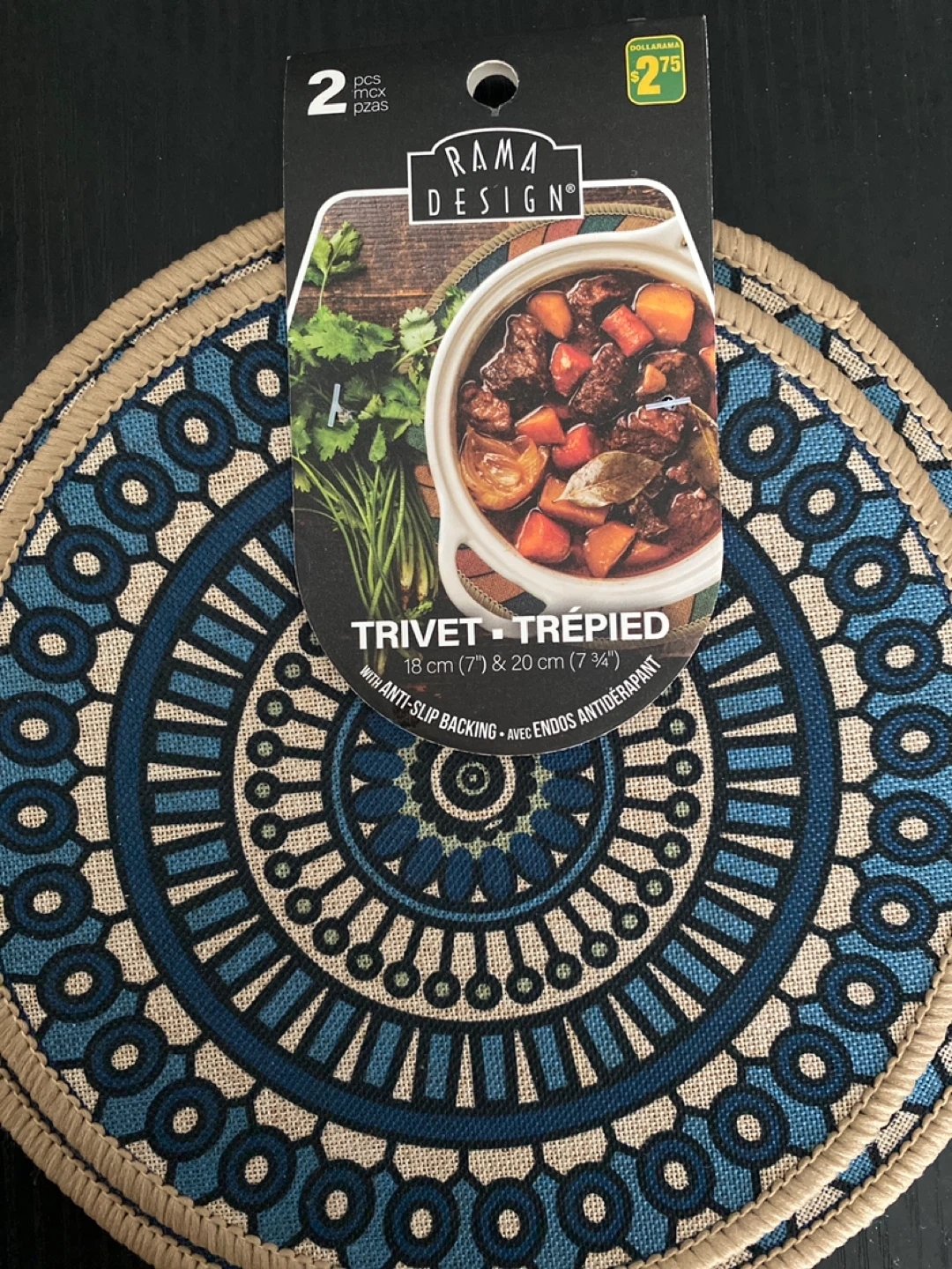 Never used, set of two trivets from Rama Design. Includes one 18 cm (7") trivet and one 20 cm (7 3/4") trivet. They feature anti-slip backing for added stability. These protect your surfaces from hot pots and pans.