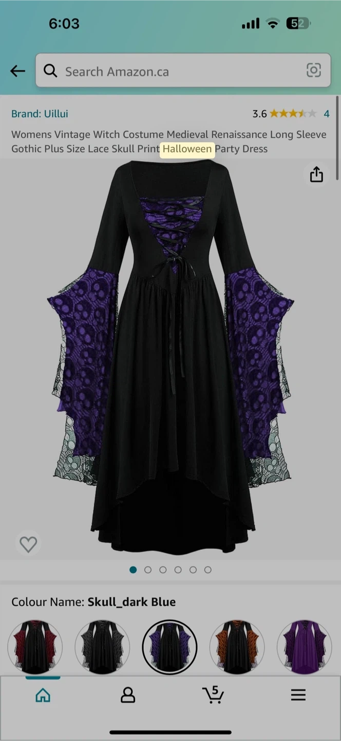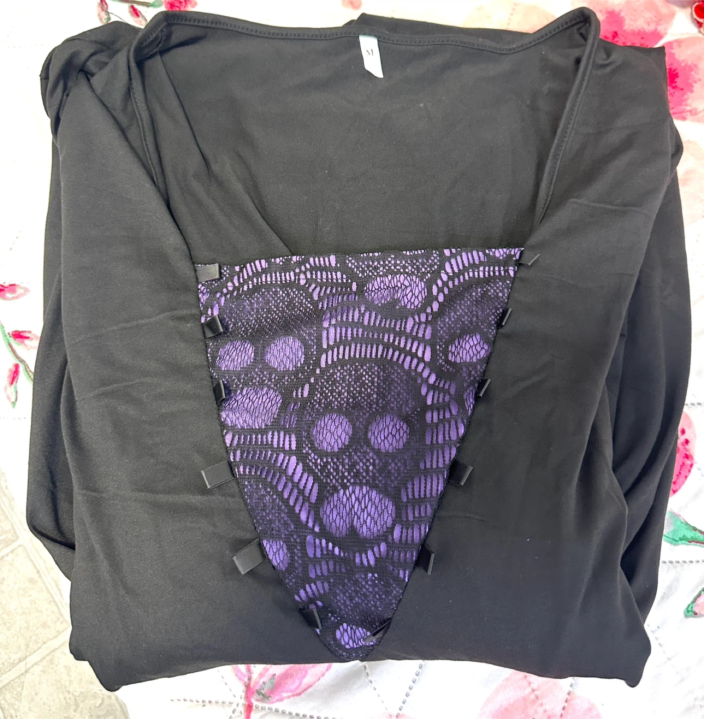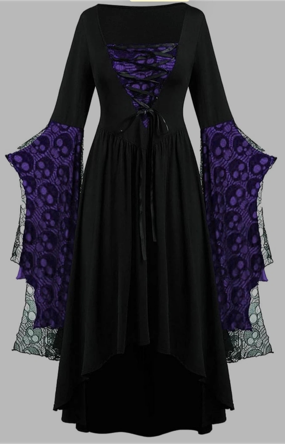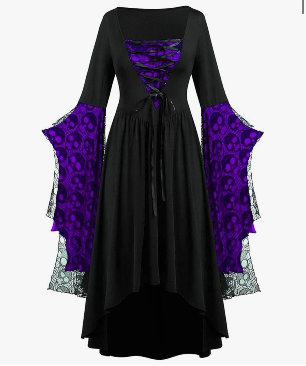 Cool black dress with purple skull lace. Has long bell sleeves. Corset style lace up front. High low hem. Size M. It is never worn costume because I ordered it from amazon and it arrived late. Actual price is $20 plus tax….. offering it for $15
