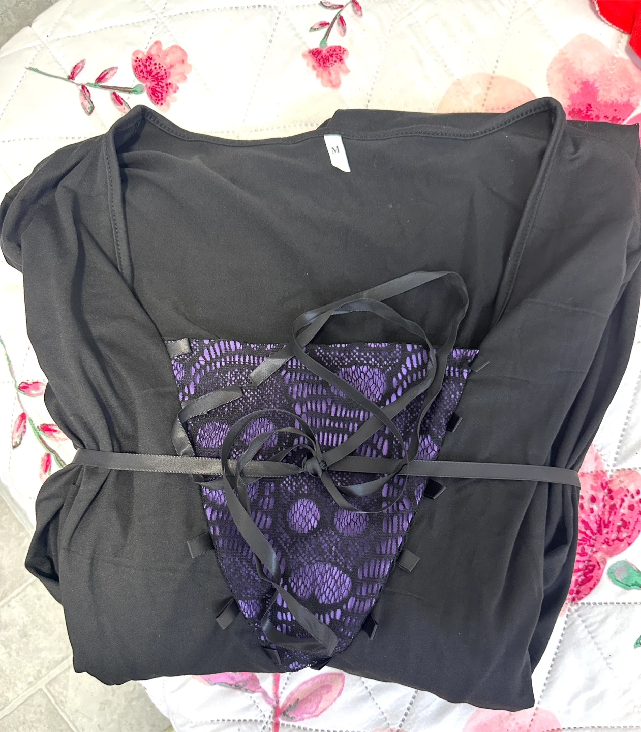 Cool black dress with purple skull lace. Has long bell sleeves. Corset style lace up front. High low hem. Size M. It is never worn costume because I ordered it from amazon and it arrived late. Actual price is $20 plus tax….. offering it for $15