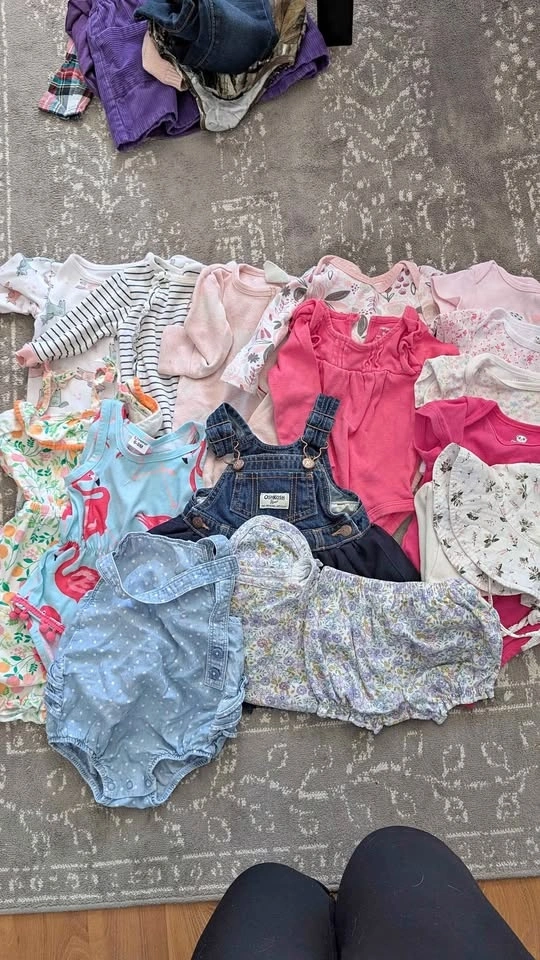 Three sleepers, two long sleeve bodysuits, four short sleeve bodysuits, three rompers, one tank top bodysuit and shorts set, one skirt overalls, one sun hat, and one pair of tights. Pick up only near St. Clair Avenue East and O'Connor.