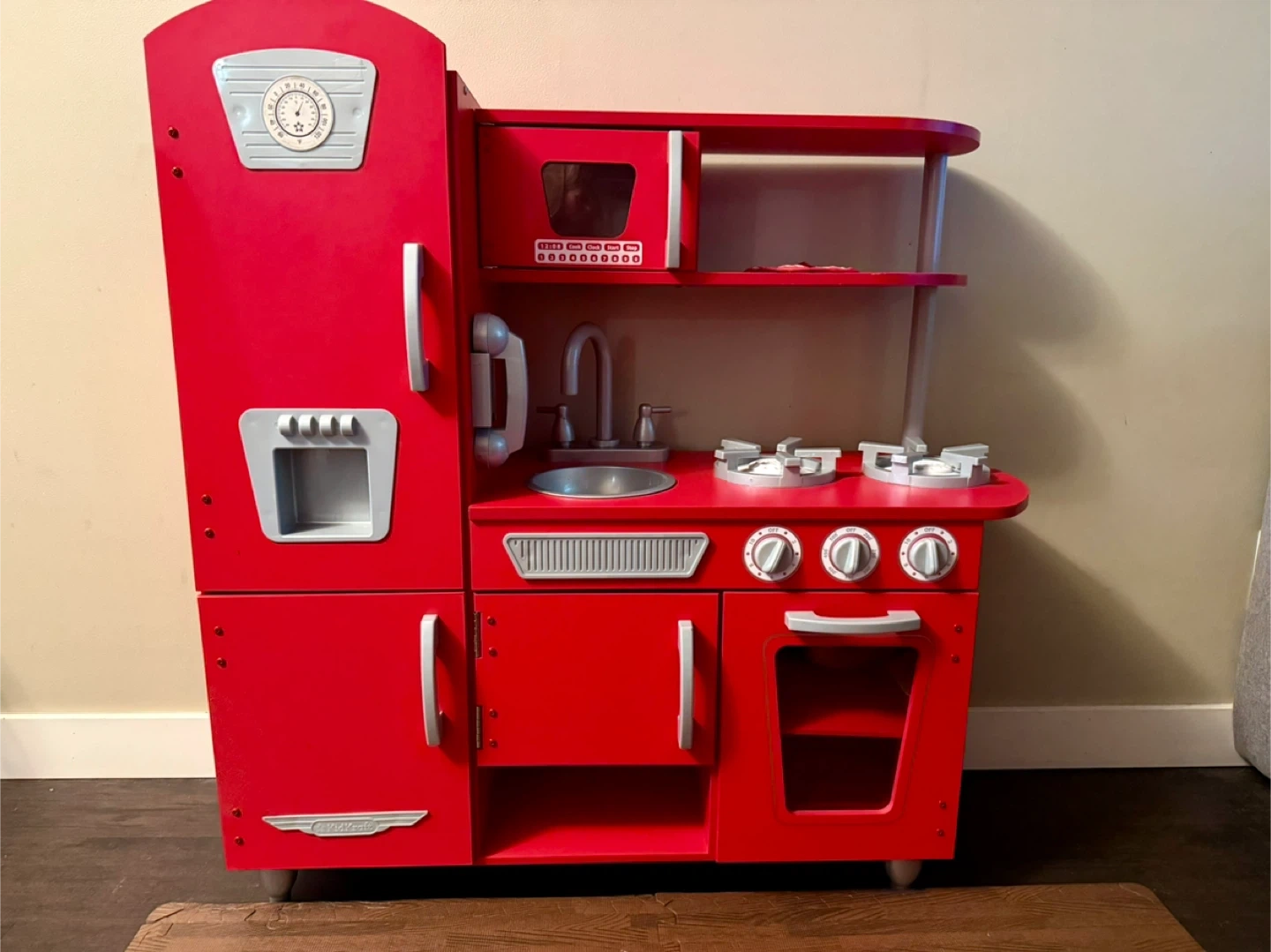 Red wooden play kitchen from KidKraft. It includes a fridge, oven, microwave, sink, and stovetop. It also comes with a basket full of play food and kitchen accessories (pots and pans). It's perfect for little chefs to explore their culinary creativity!