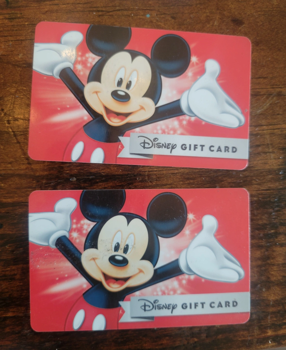 Two unused Disney gift cards. $50 in each card. Total value of $100 but I am offering for less.. My child has outgrown the Disney days.