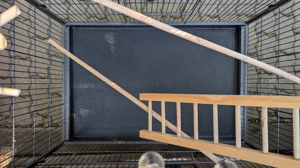 Metal frame, rolling base, and multiple perches and ladder included.
