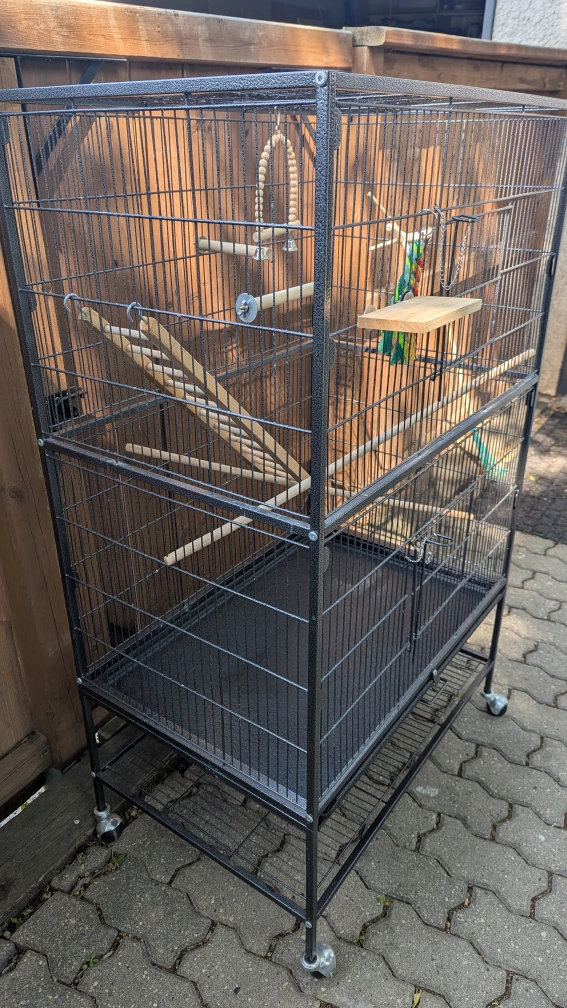 A spacious bird cage, ready for a new home. Features multiple levels and perches, creating a stimulating environment. Perfect for bringing peace to your feathered friend. Was originally purchased on Amazon, and was only used less than 1 year.