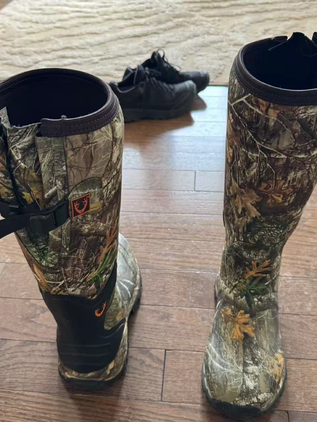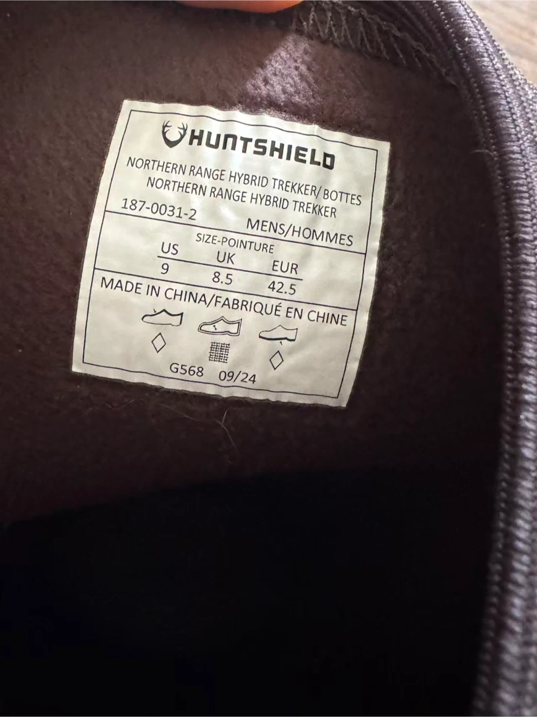 Huntshield Northern Range Hybrid Trekker boots in a camouflage pattern. Men's size 9 US. Made in China. These boots offer warmth and protection for outdoor activities.