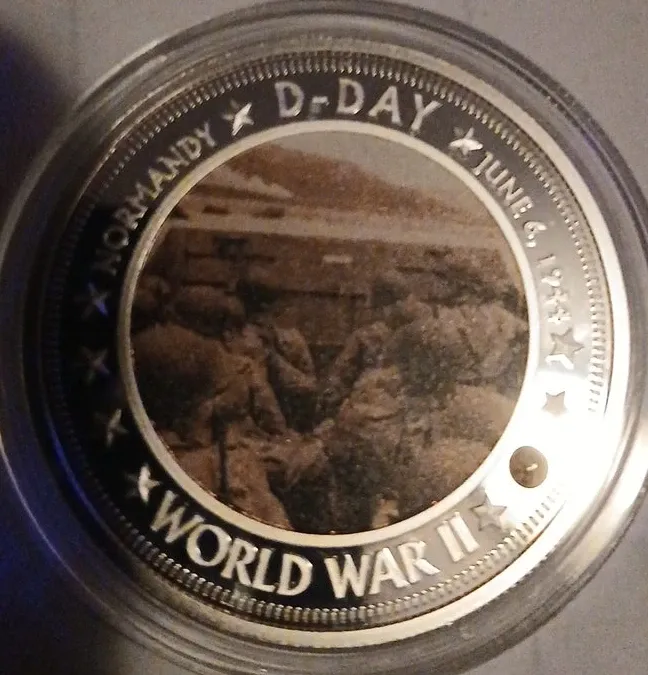 Commemorative coin celebrating D-Day and World War II. Features "Normandy D-Day June 6, 1944" and "World War II" on one side. The reverse side reads "We Will Accept Nothing Less Than Full Victory" and "Operation Overlord" with an image of airborne troops. A great piece for history collectors! B/o