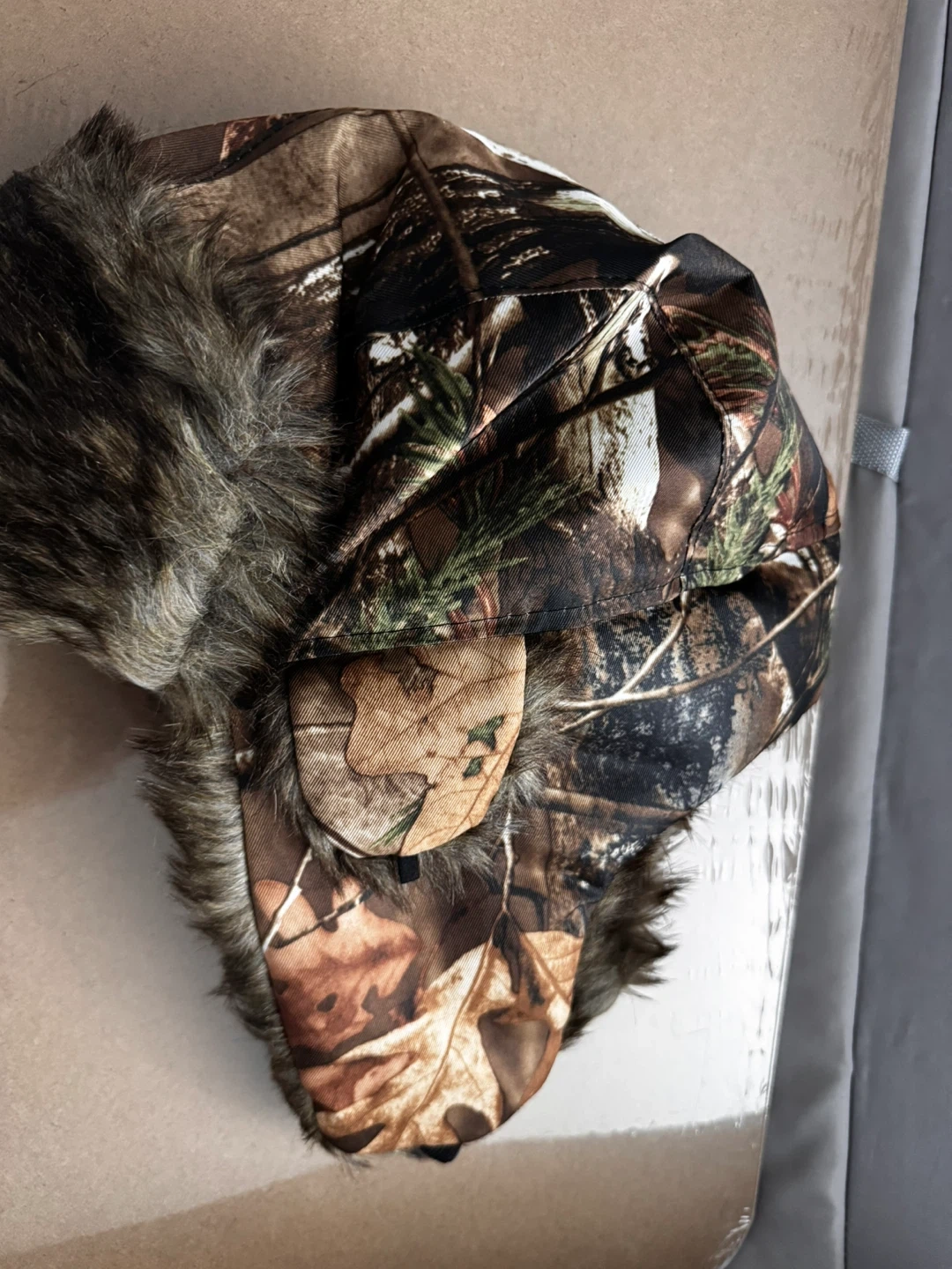 This trapper hat features a camouflage pattern with faux fur trim. It has ear flaps for extra warmth. Great for cold weather outdoor activities!