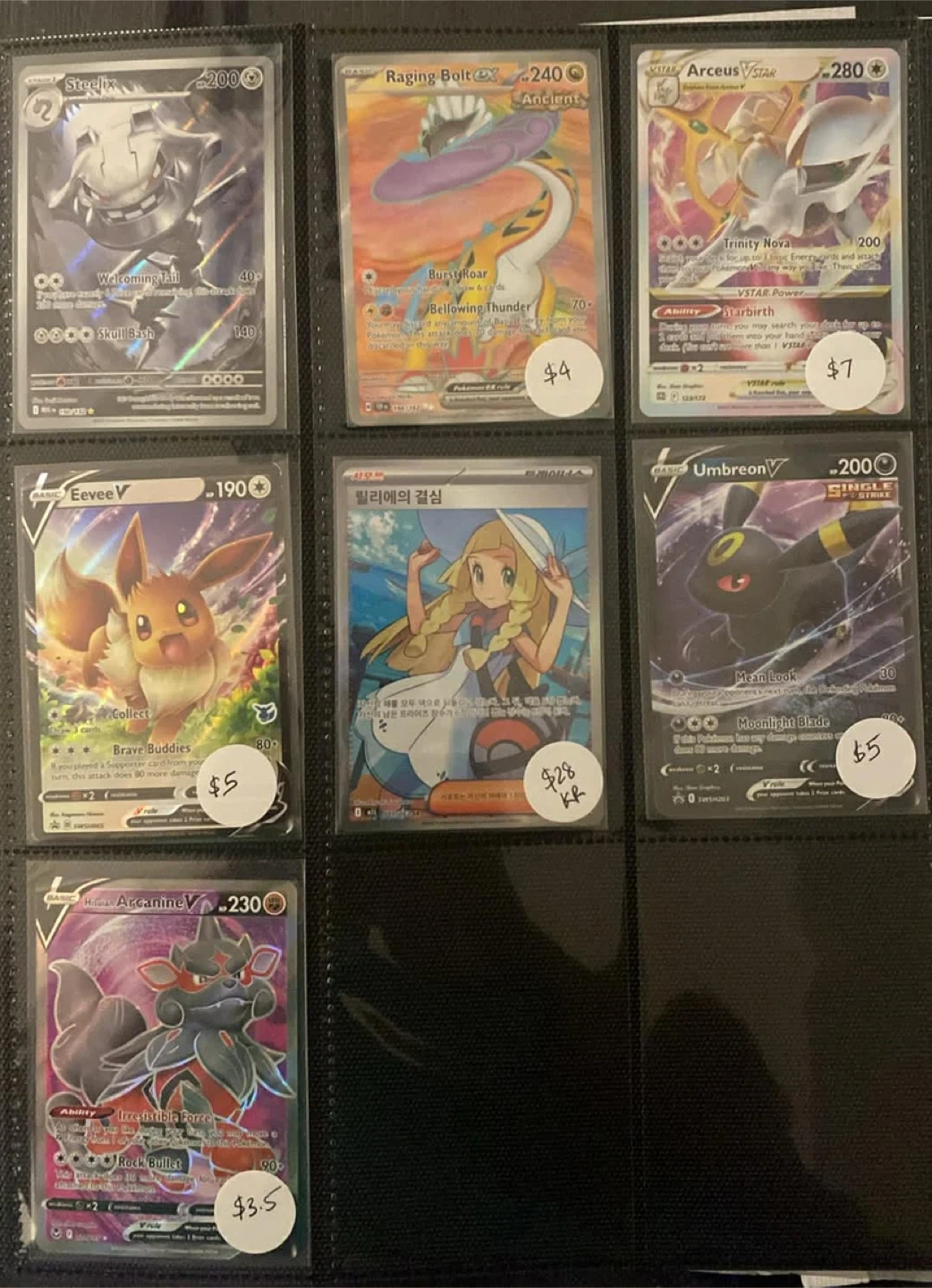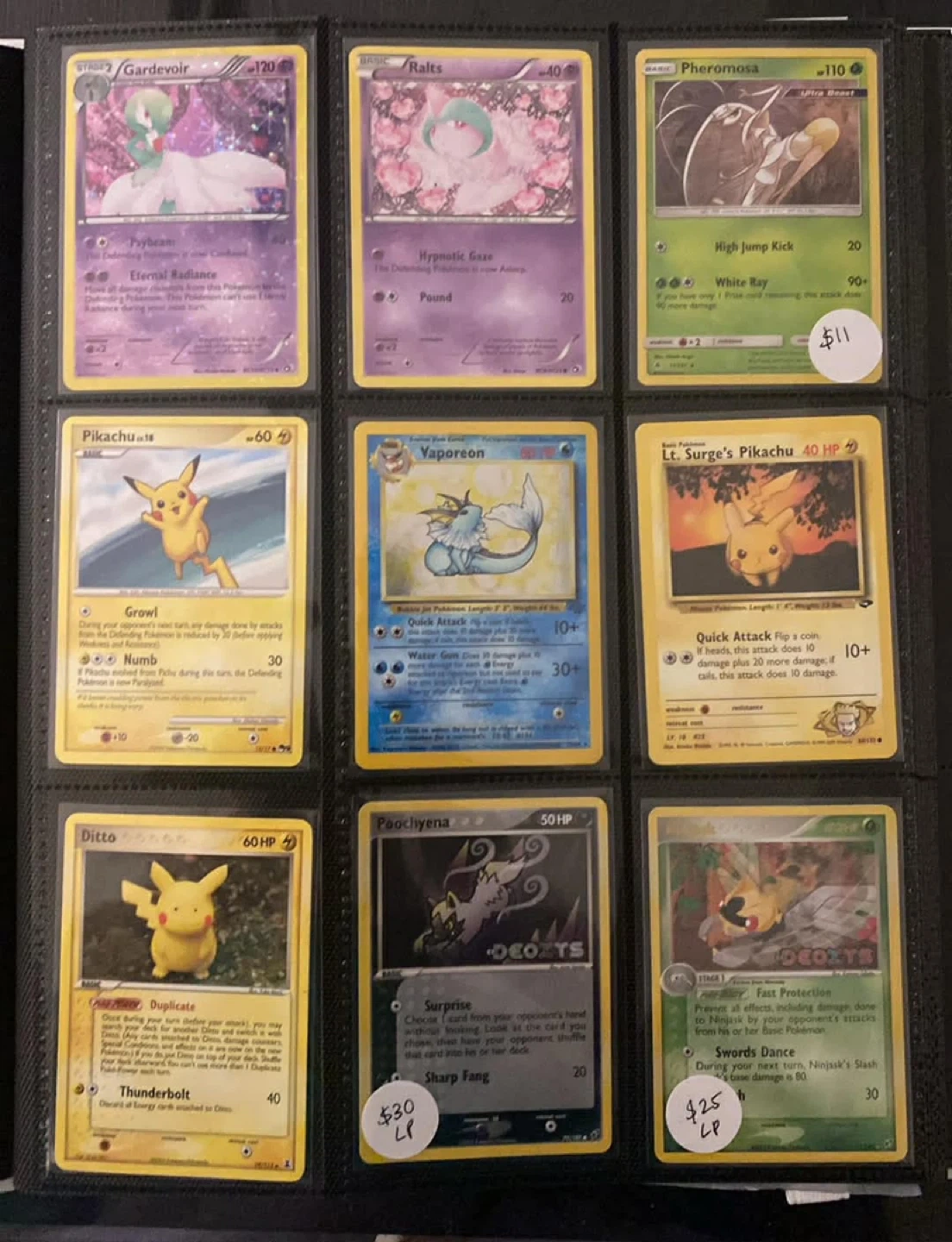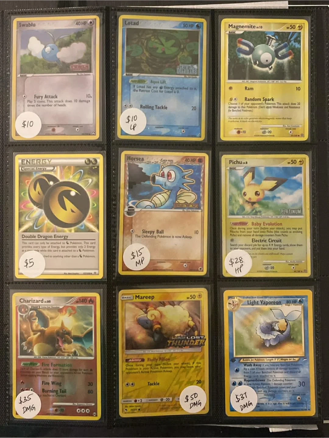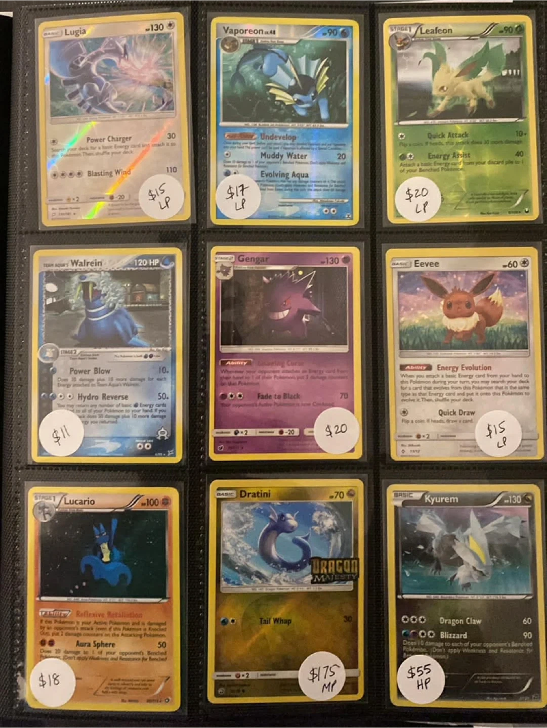 Collection of various Pokémon trading cards featuring multiple Pokémon characters and card types. These cards are great for collectors and players alike. Some cards have individual pricing noted on them.