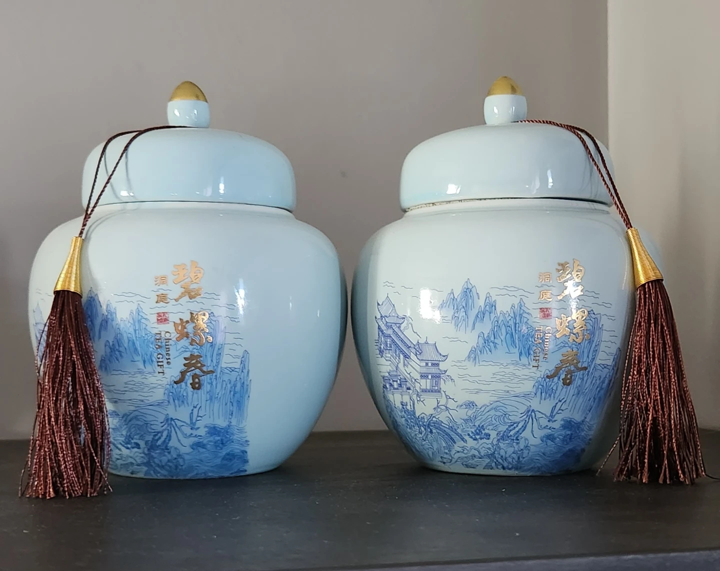 Brought from China. These are two beautiful light blue porcelain jars with a scenic blue landscape design and gold accents. They're adorned with elegant gold tassels. These jars are perfect for storing small items or as decorative pieces in your home.