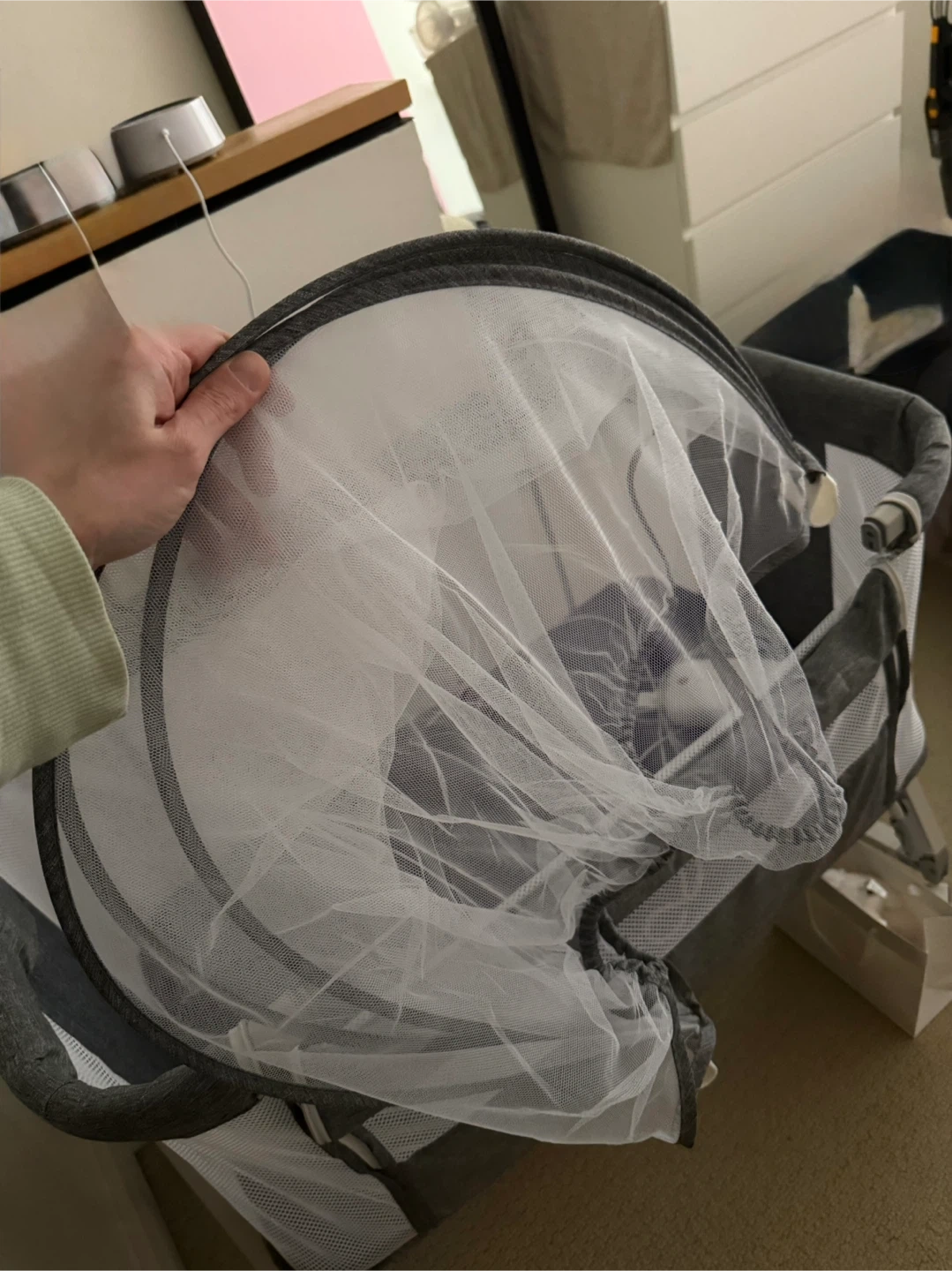 This bassinet is designed for infants. It features mesh sides for breathability and comes with a mosquito net for added protection. The bassinet is grey and has a lightweight frame with wheels for easy movement. It's suitable for newborns and younger babies.