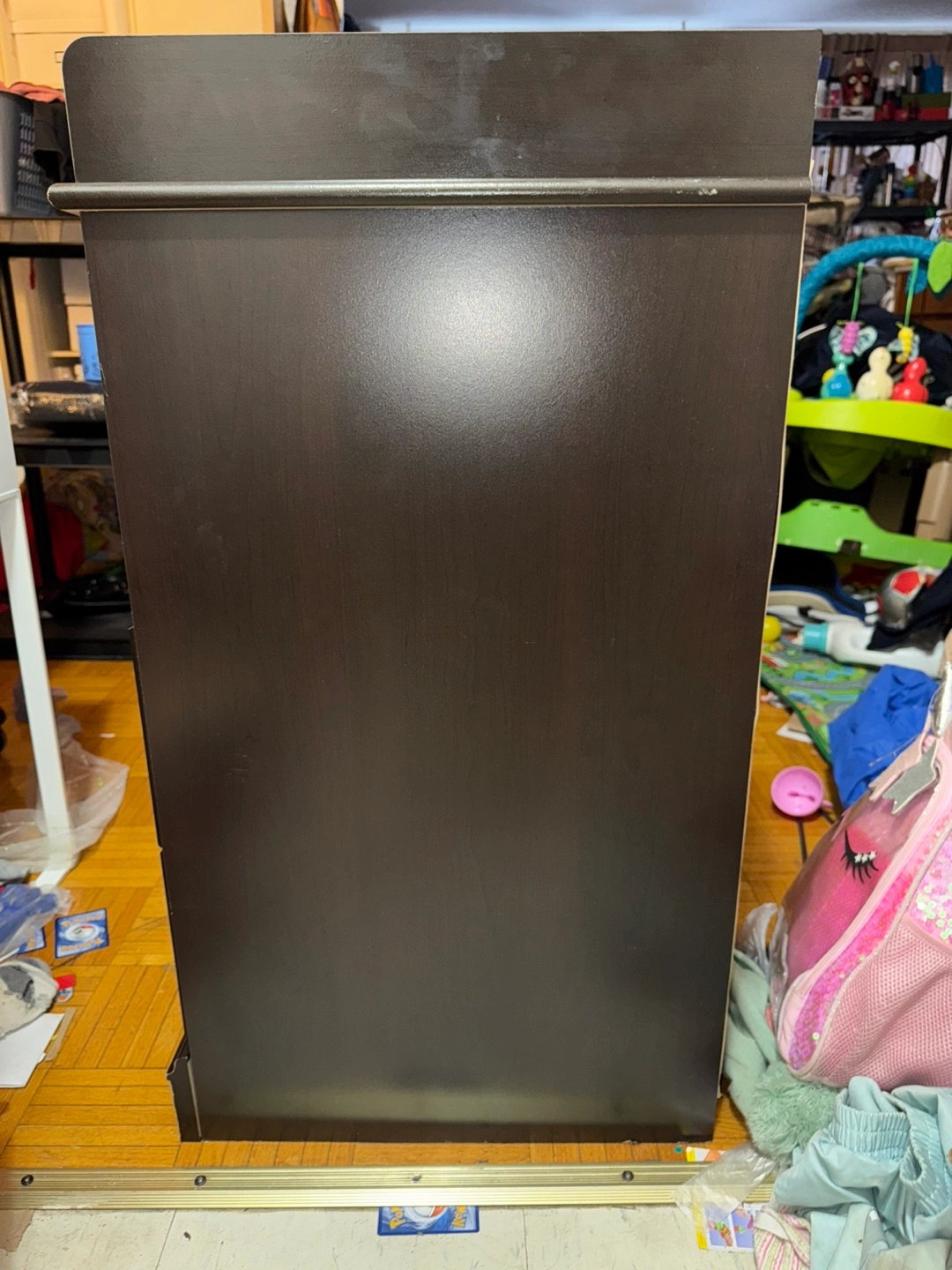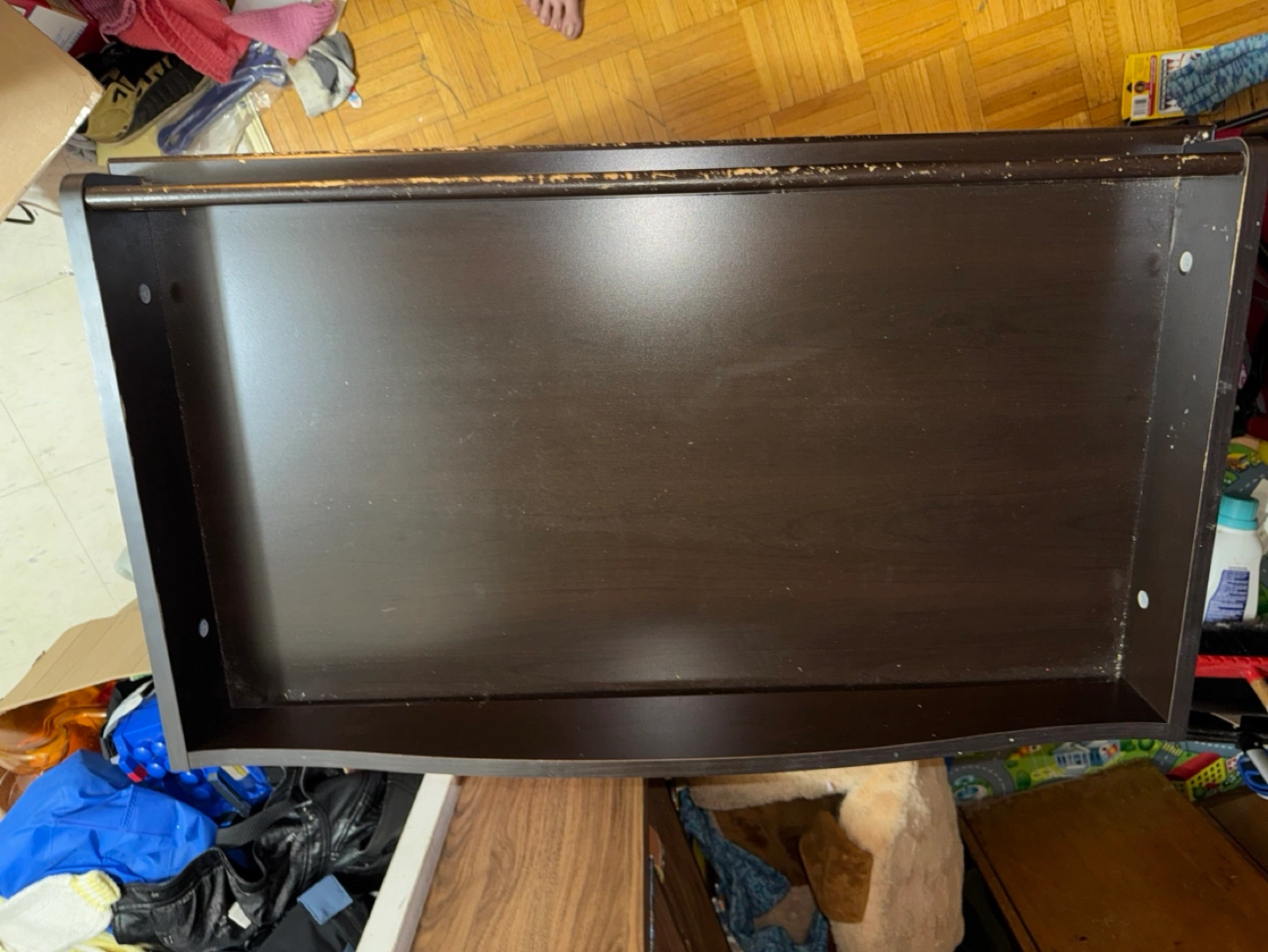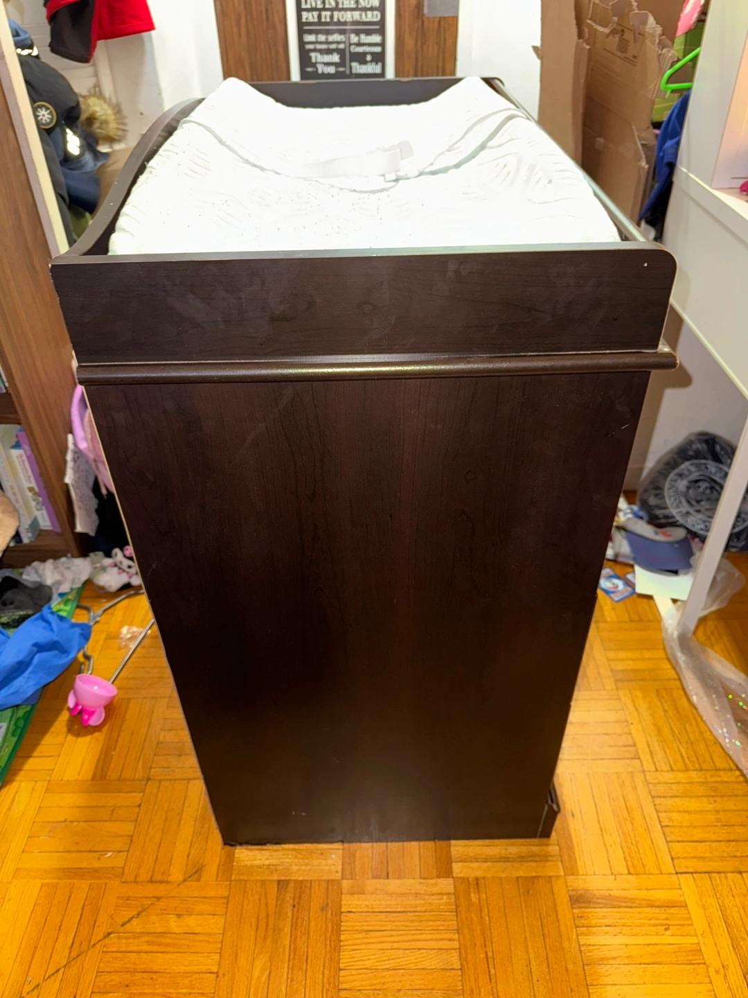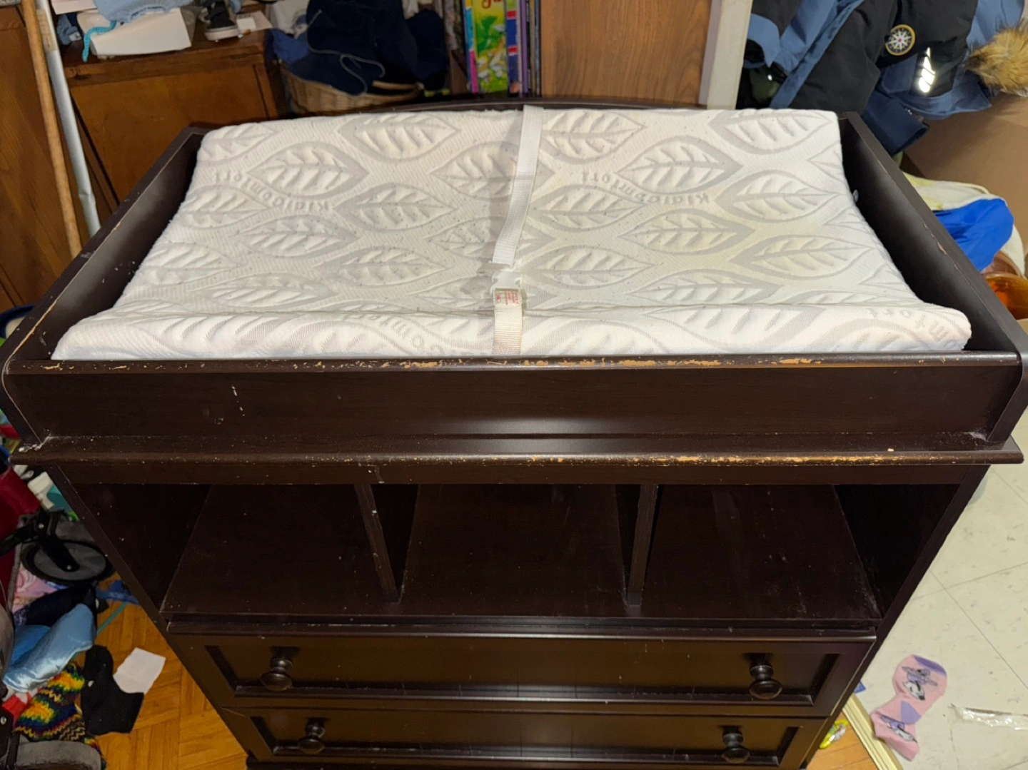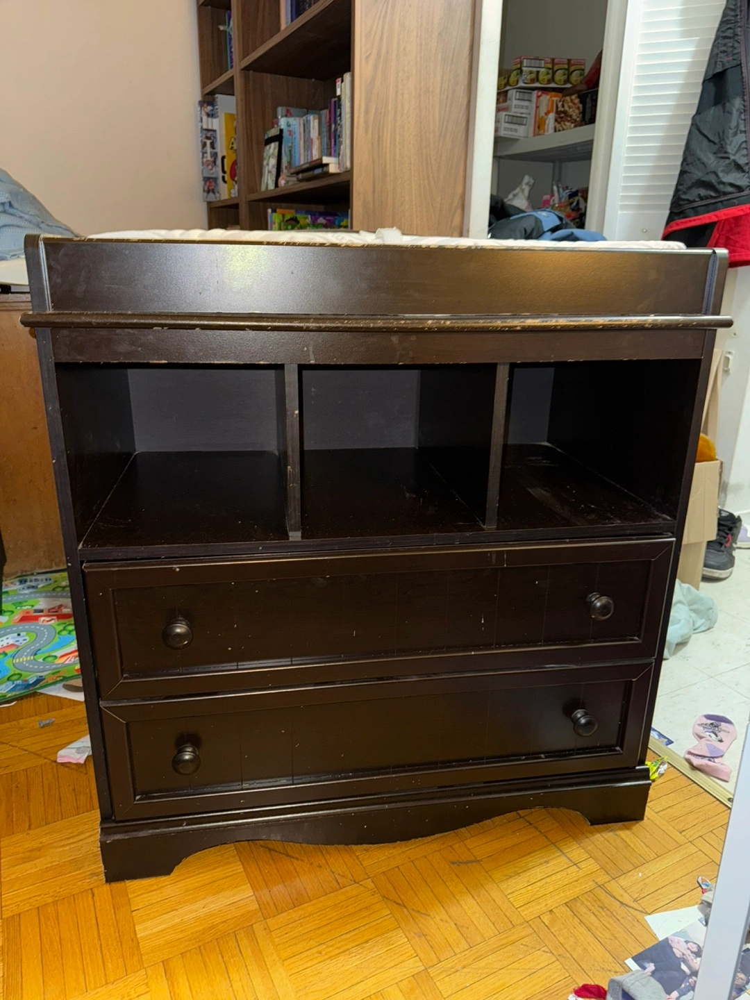 Dark brown changing table. Two drawers, open shelving. Some minor scratches and wear. Very solid. KidKraft changing pad and 2 washable covers included. Original retail price $310