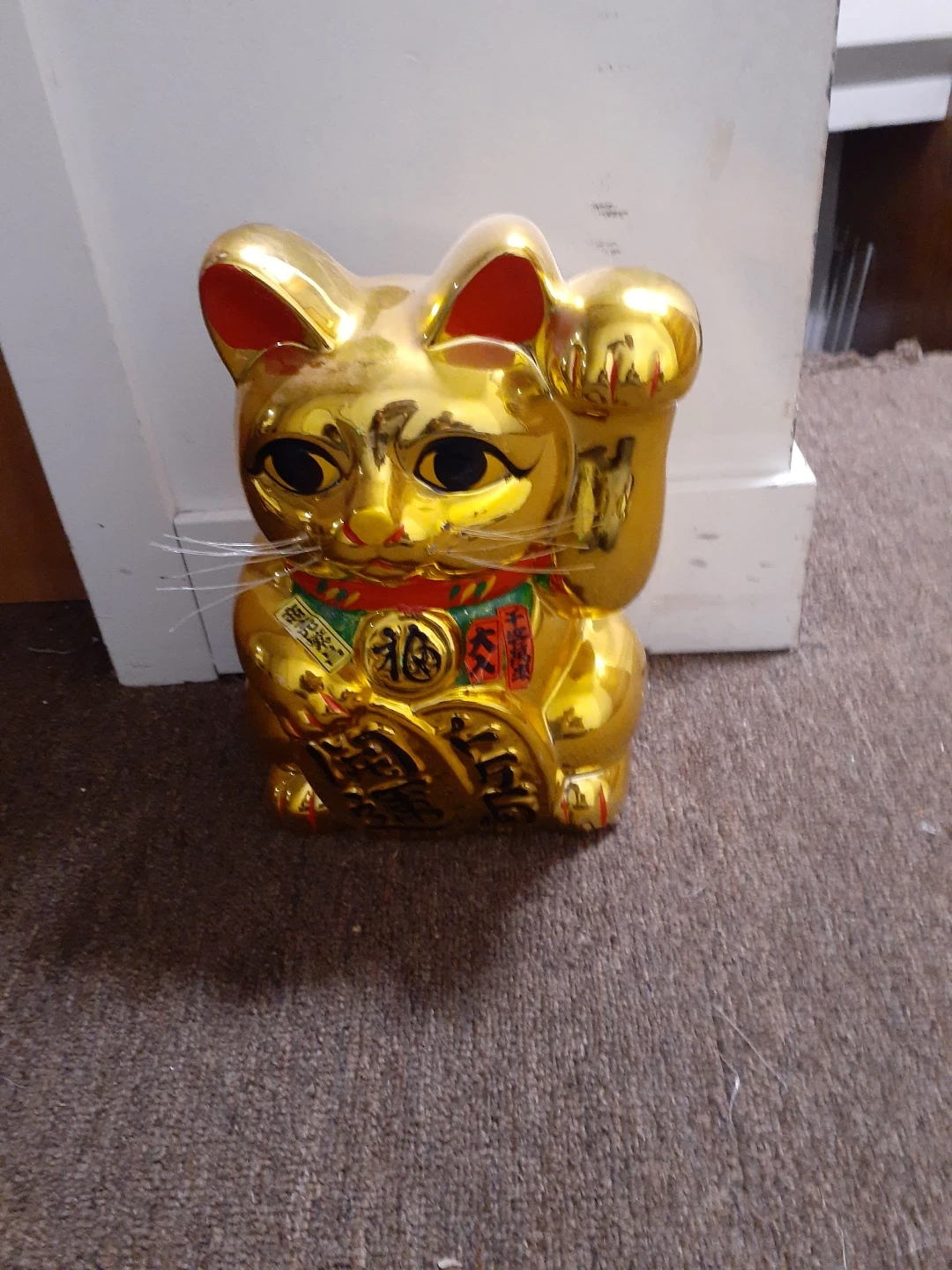 This is a golden Maneki-neko, or lucky cat figurine. It's made of a shiny, metallic material. The cat has a raised paw, often believed to bring good fortune. It's a classic piece for welcoming luck and prosperity!