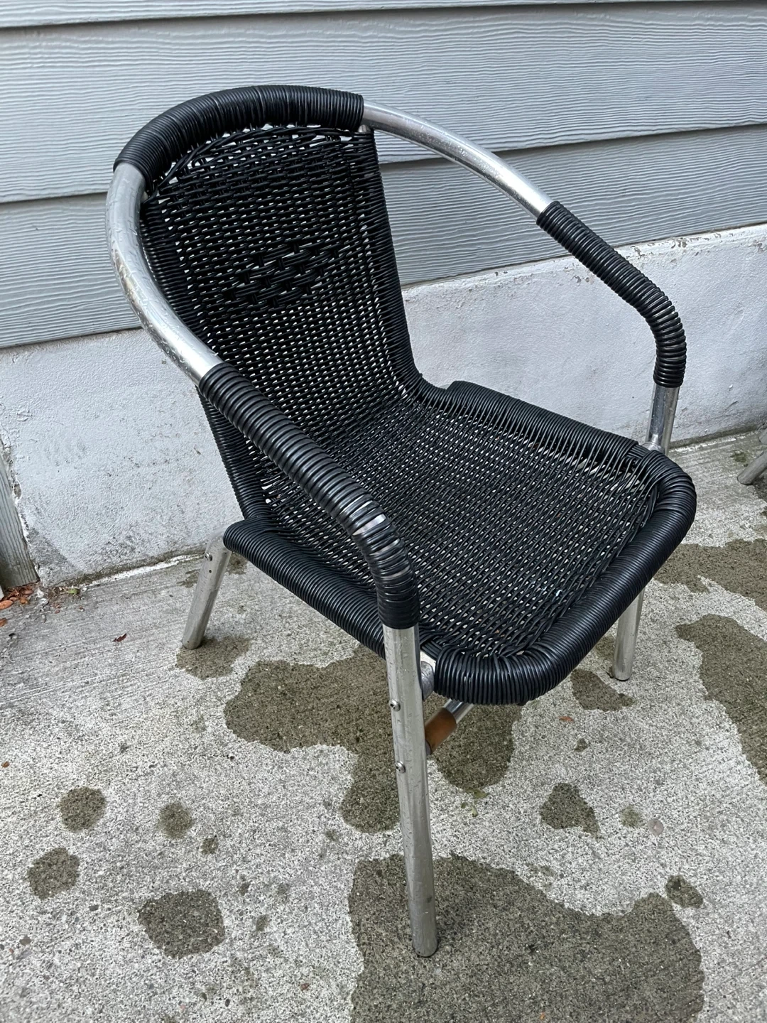Stackable Wicker outdoor bistro patio chairs. It's in good condition and perfect for your patio or balcony. The chair features a sturdy metal frame and woven wicker seat and back for comfort and style.