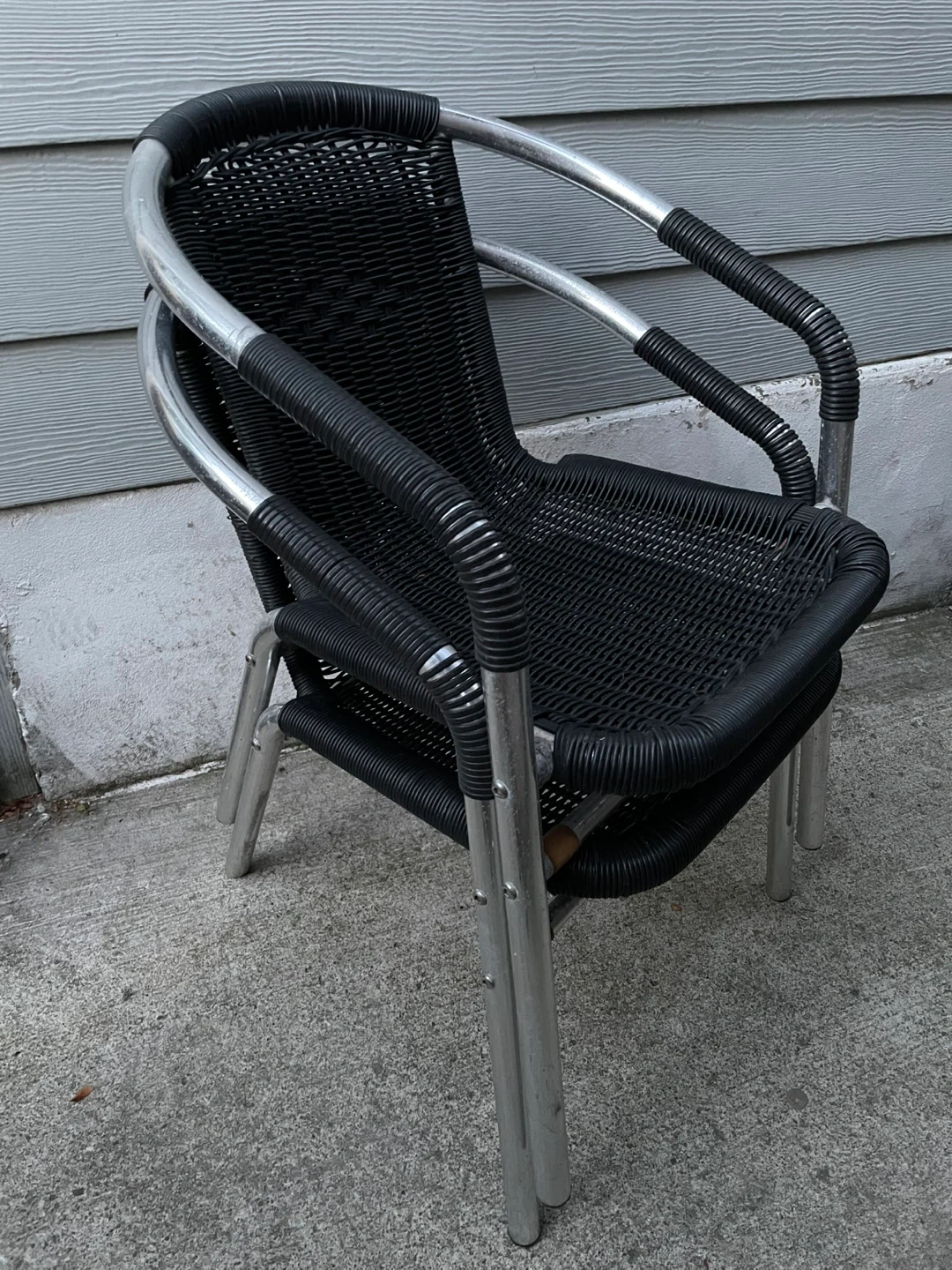 Stackable Wicker outdoor bistro patio chairs. It's in good condition and perfect for your patio or balcony. The chair features a sturdy metal frame and woven wicker seat and back for comfort and style.
