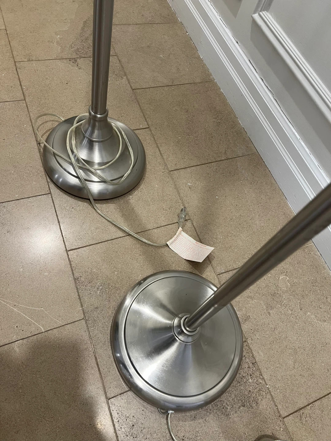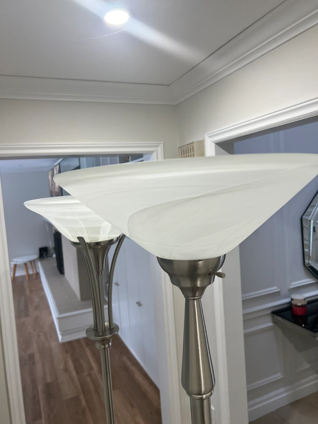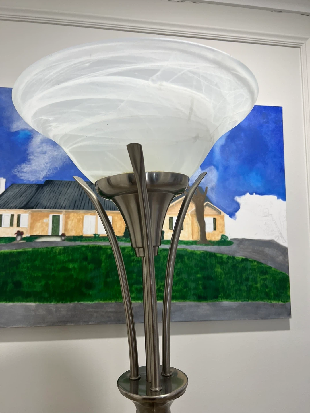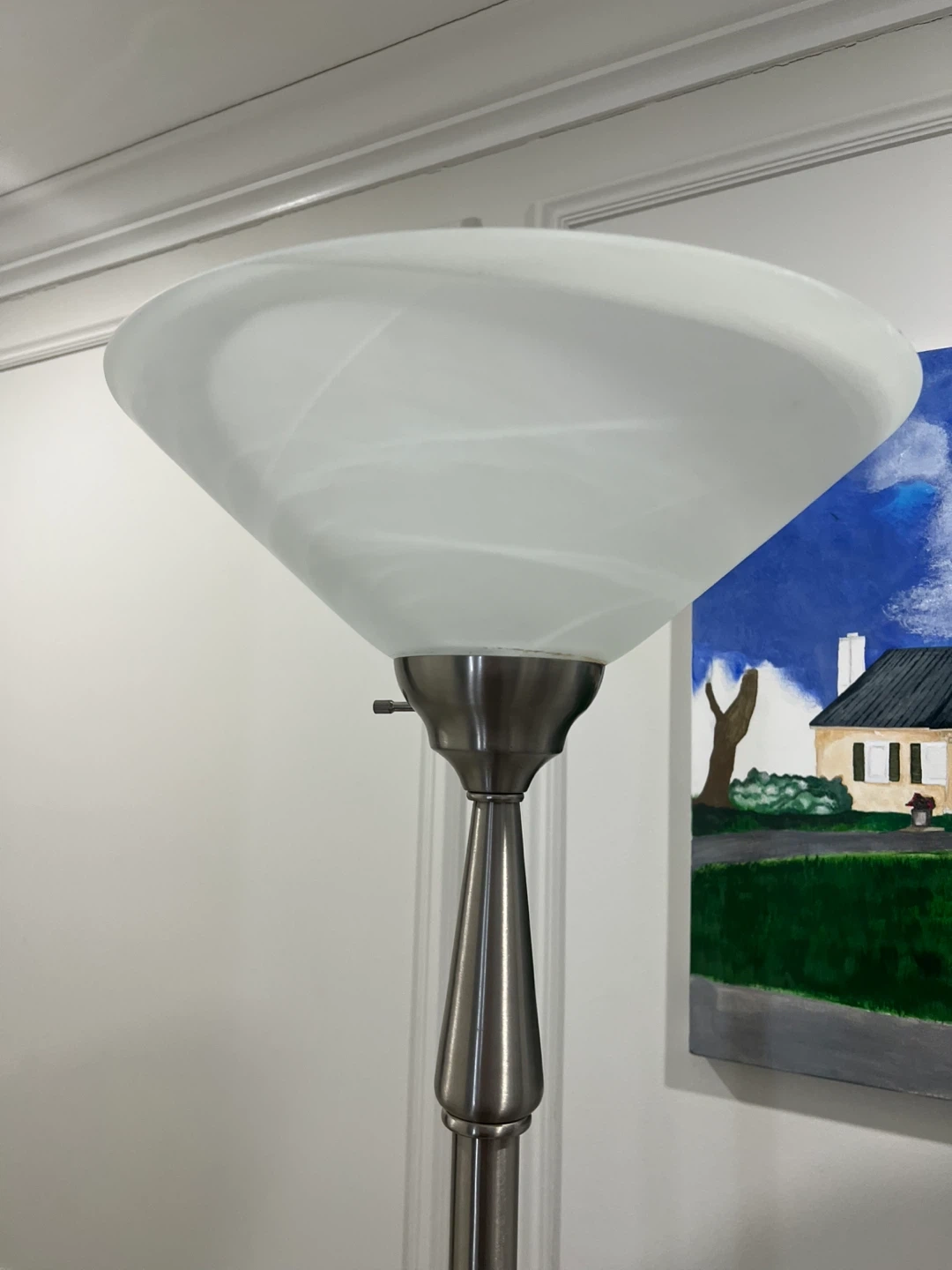 This pair of floor lamps features brushed nickel stands and frosted glass shades with subtle swirling patterns. They provide ambient lighting and would suit any room. Both lamps are in good working condition.