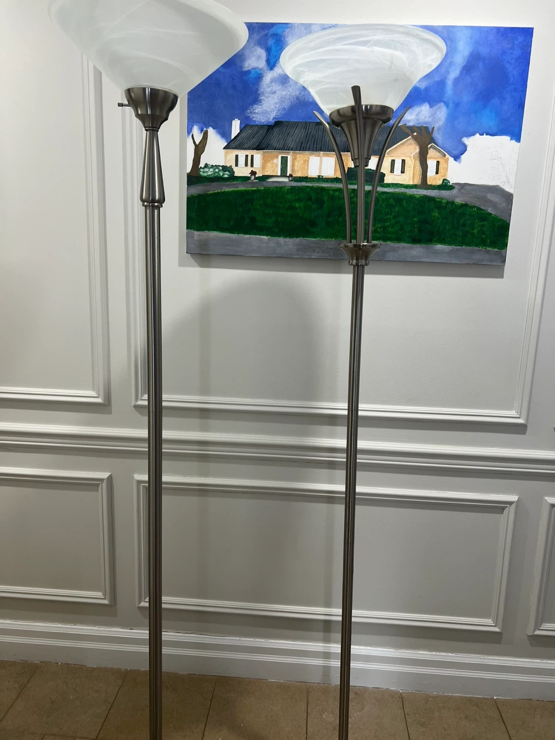 This pair of floor lamps features brushed nickel stands and frosted glass shades with subtle swirling patterns. They provide ambient lighting and would suit any room. Both lamps are in good working condition.