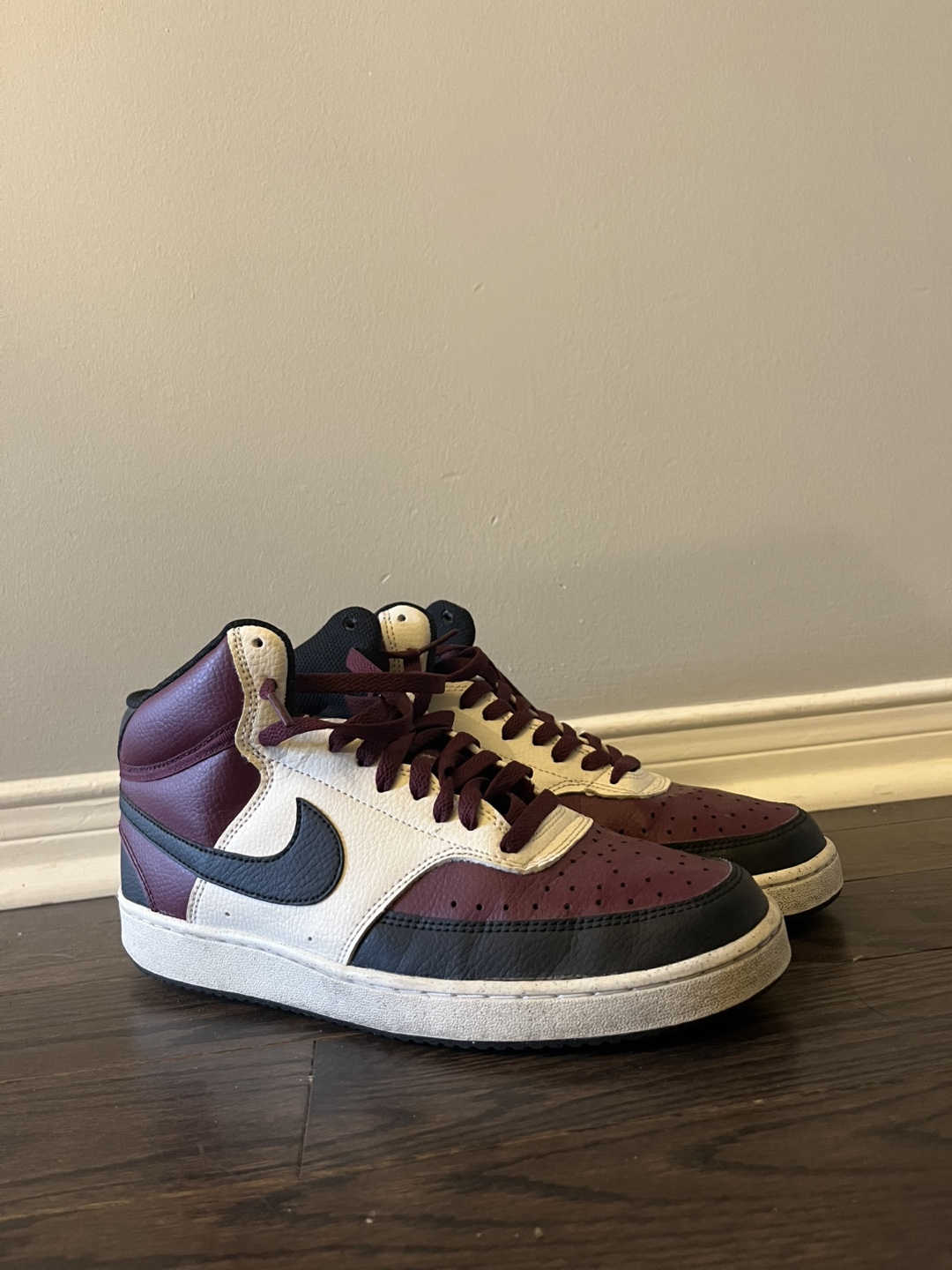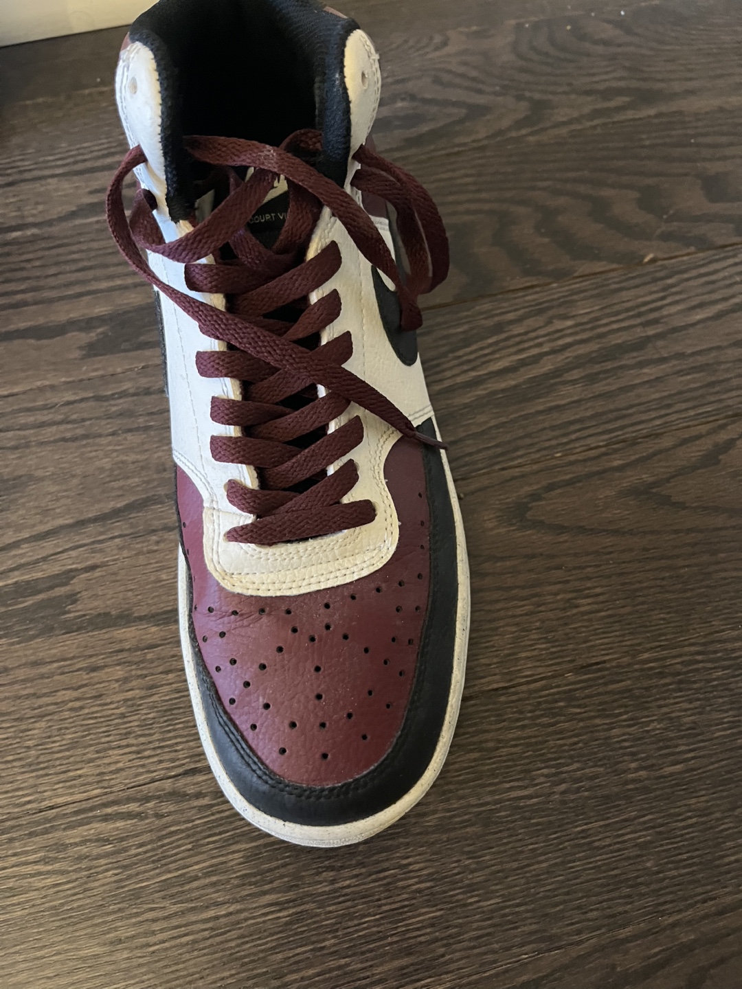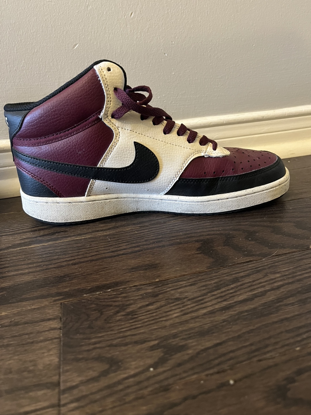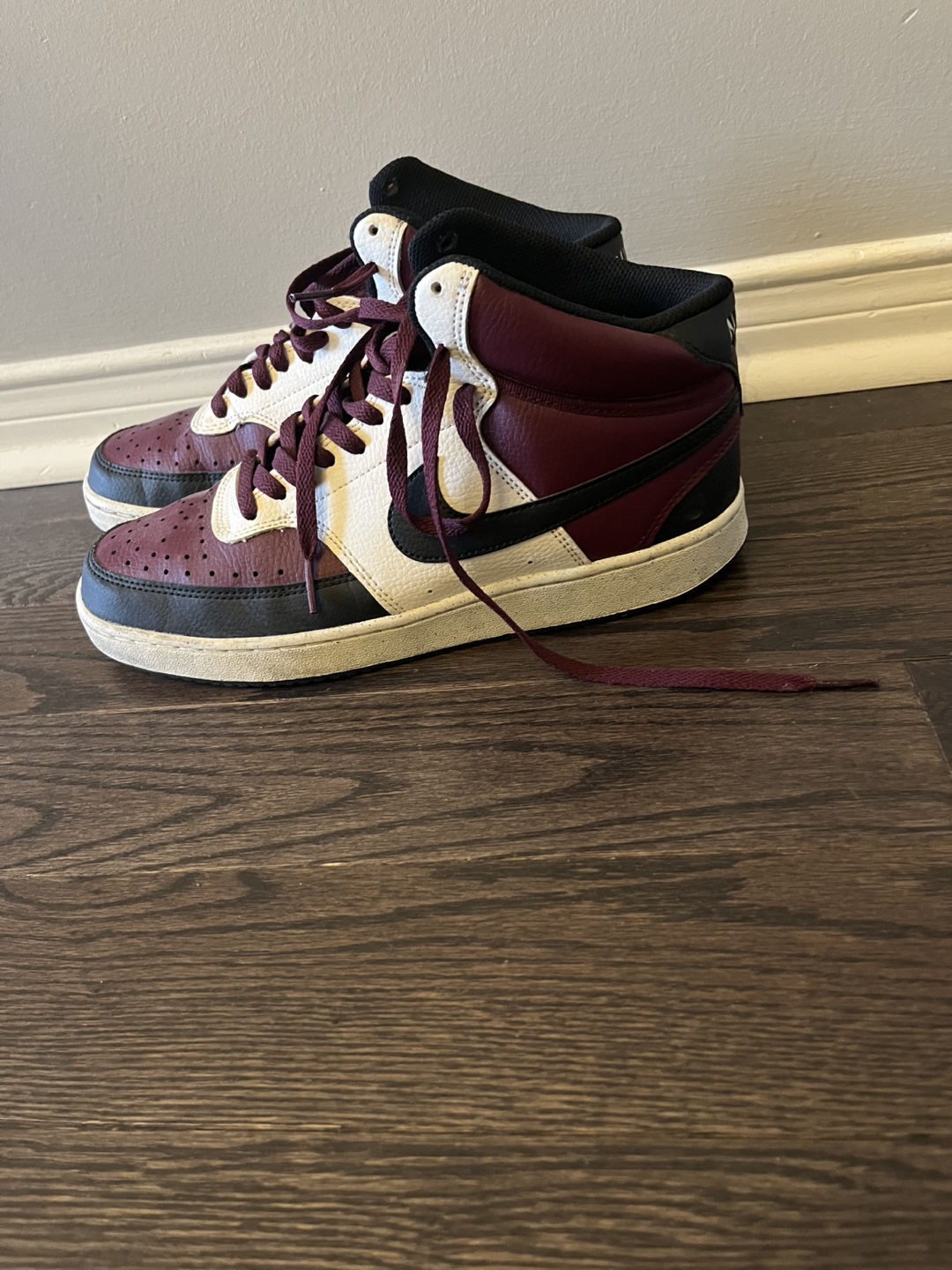 Men's high-top sneakers. Burgundy, black, and off-white colour scheme. Leather upper. Lace-up closure. Good condition.