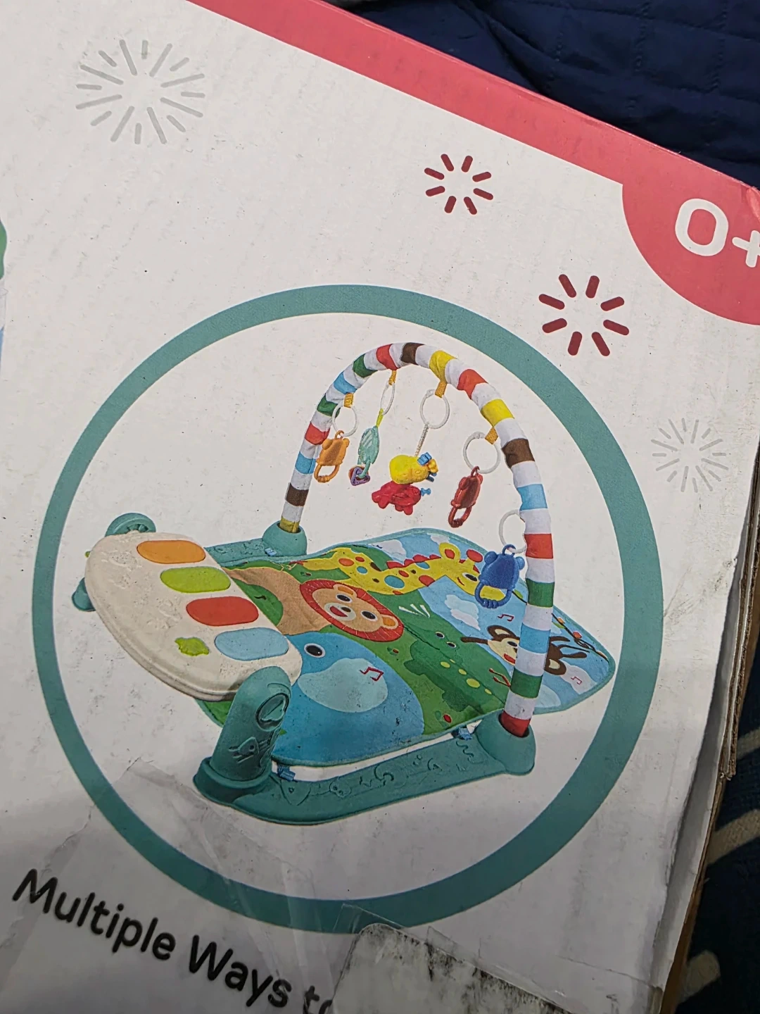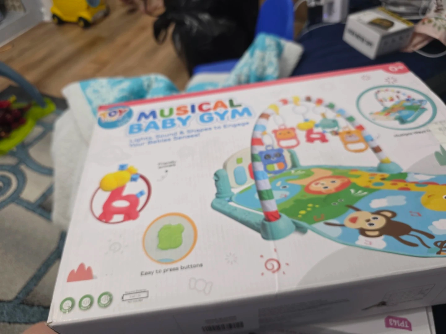 This musical baby gym features lights, sounds, and shapes to engage your baby's senses. It's designed with friendly animals and easy-to-press buttons. Requires 3 AA batteries, not included. Suitable for ages 0+.