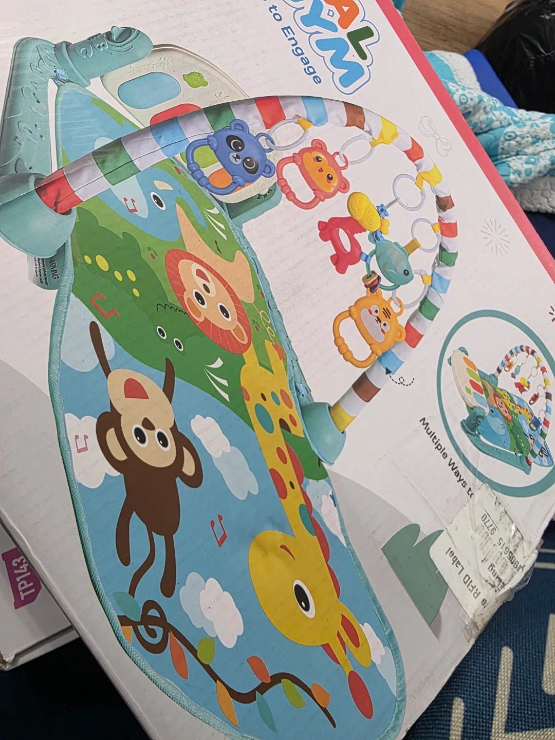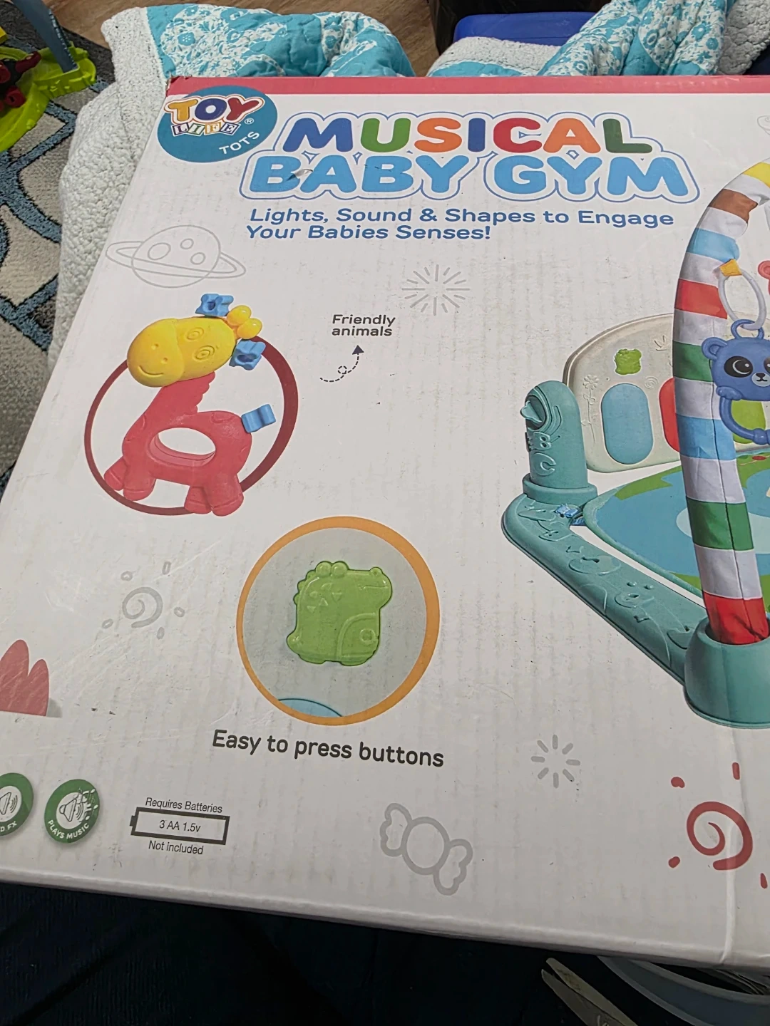 This musical baby gym features lights, sounds, and shapes to engage your baby's senses. It's designed with friendly animals and easy-to-press buttons. Requires 3 AA batteries, not included. Suitable for ages 0+.