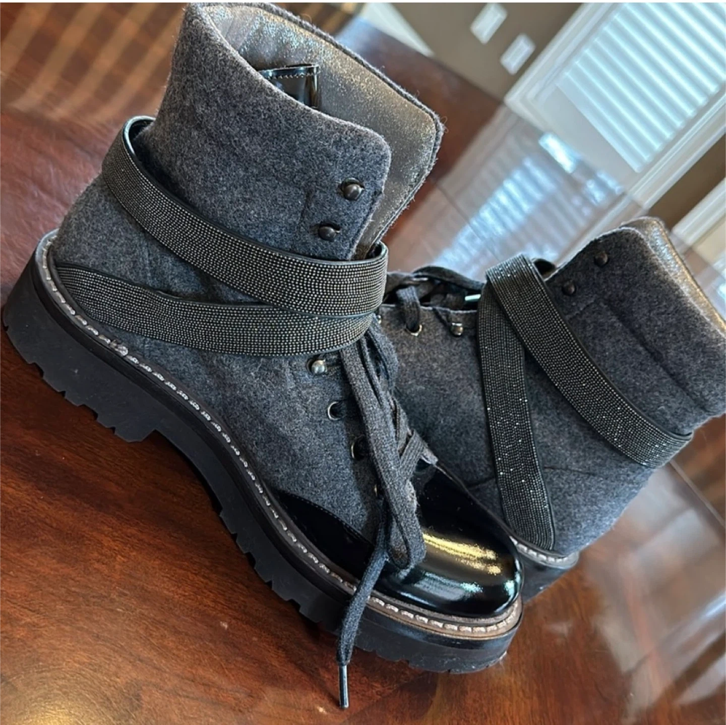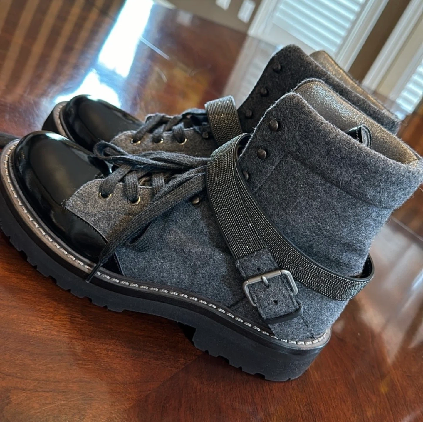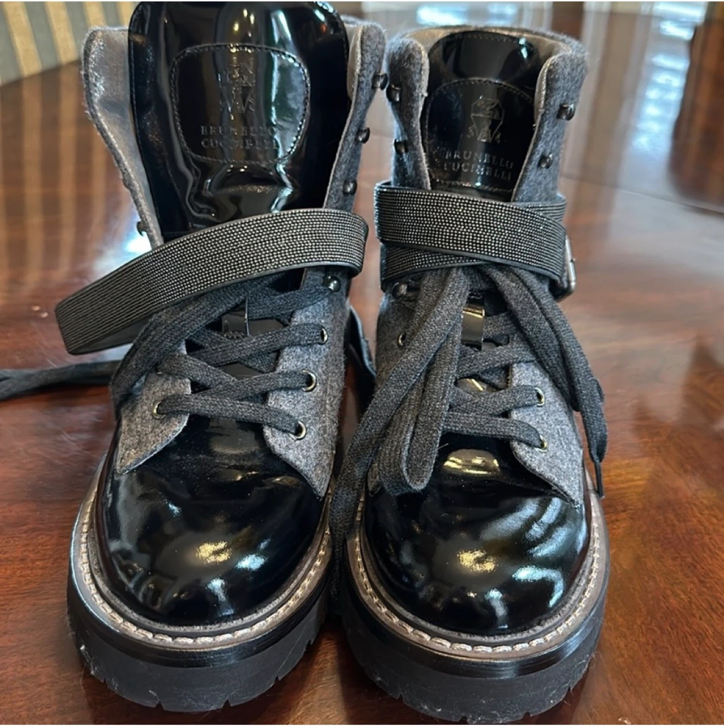 100% AUTHENTIC - These stylish Brunello Cucinelli boots feature a unique blend of grey wool and patent leather. They have a lace-up front with an adjustable buckle strap around the ankle. Perfect for adding a touch of edge to any outfit!