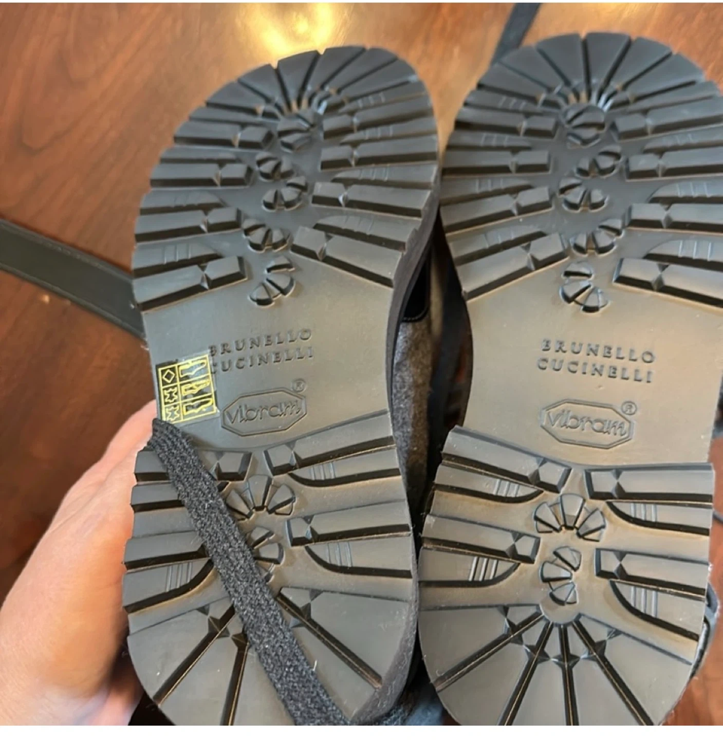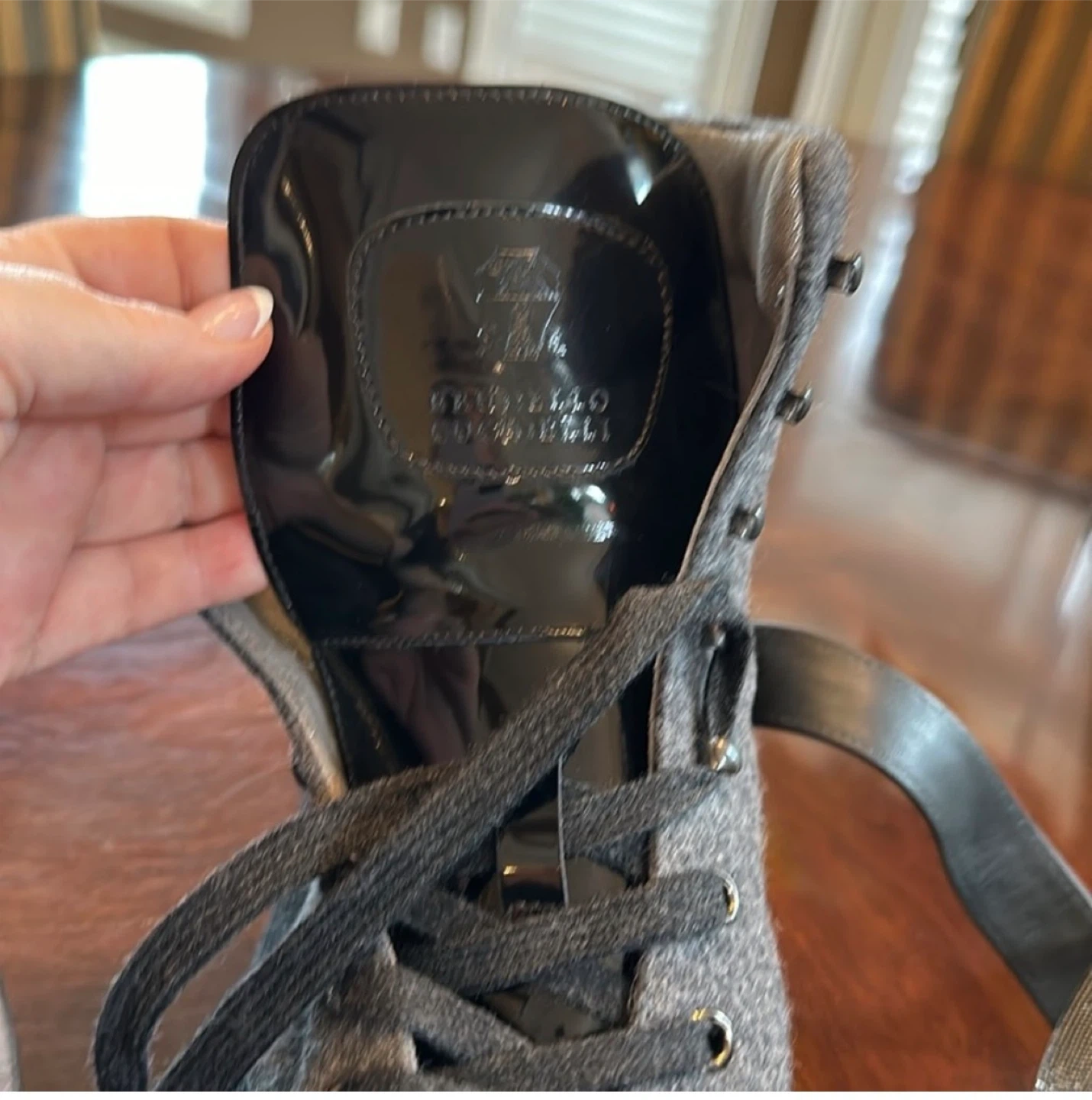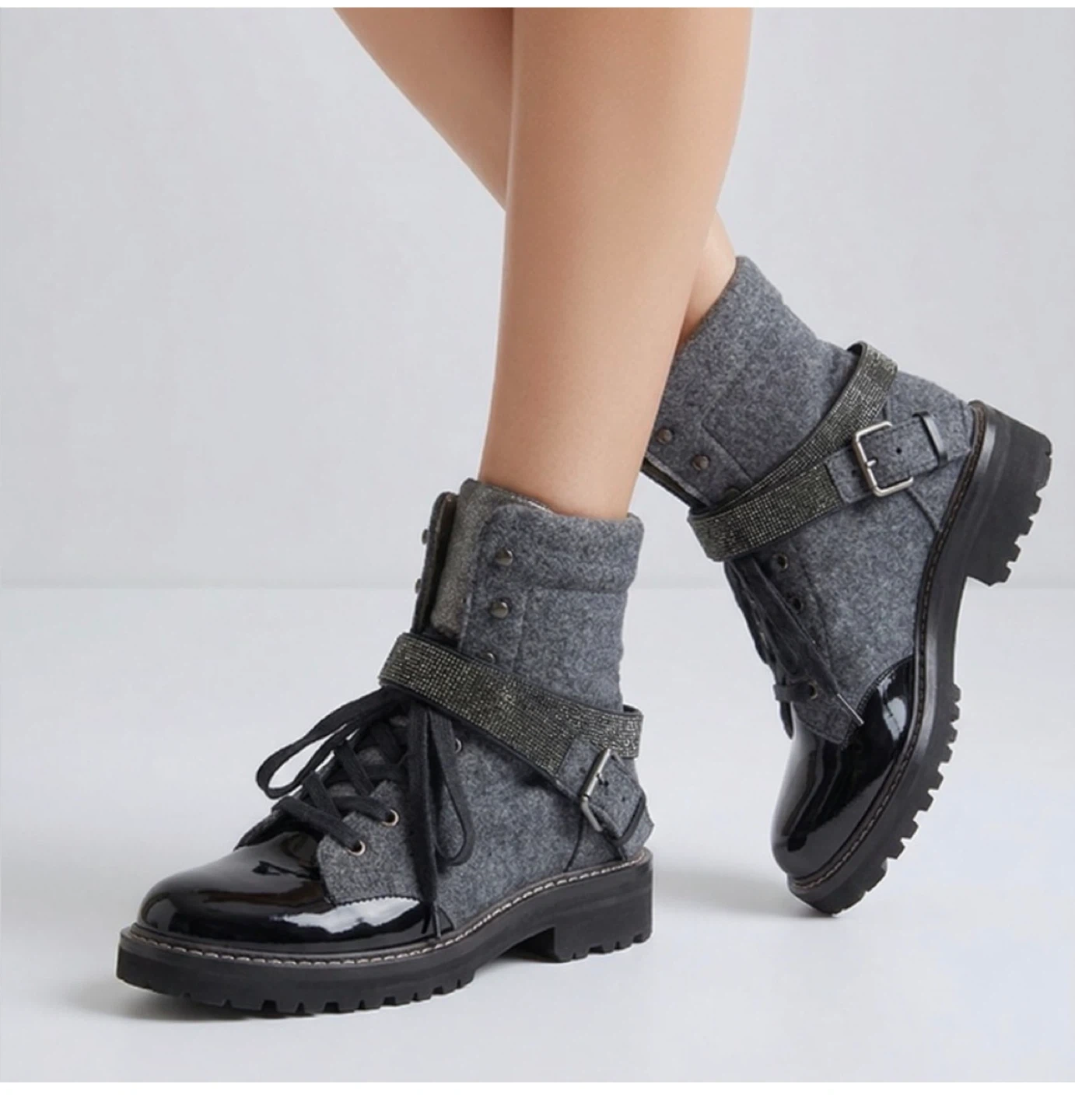 100% AUTHENTIC - These stylish Brunello Cucinelli boots feature a unique blend of grey wool and patent leather. They have a lace-up front with an adjustable buckle strap around the ankle. Perfect for adding a touch of edge to any outfit!