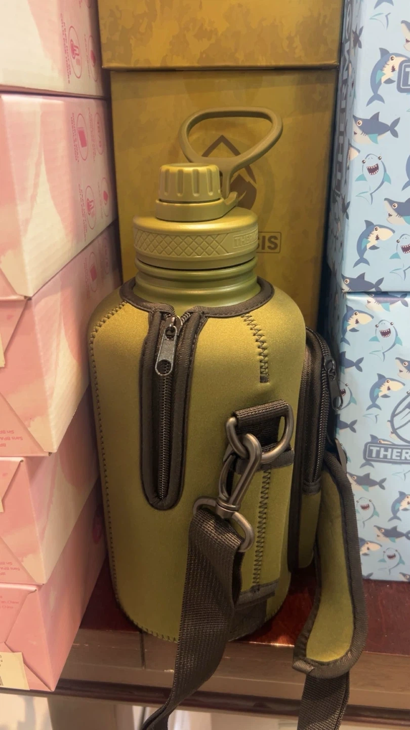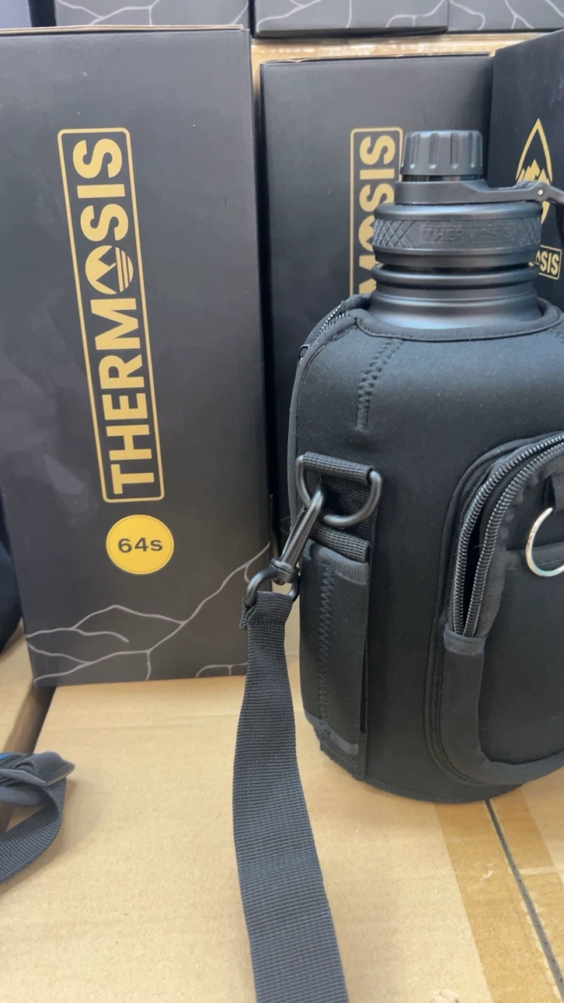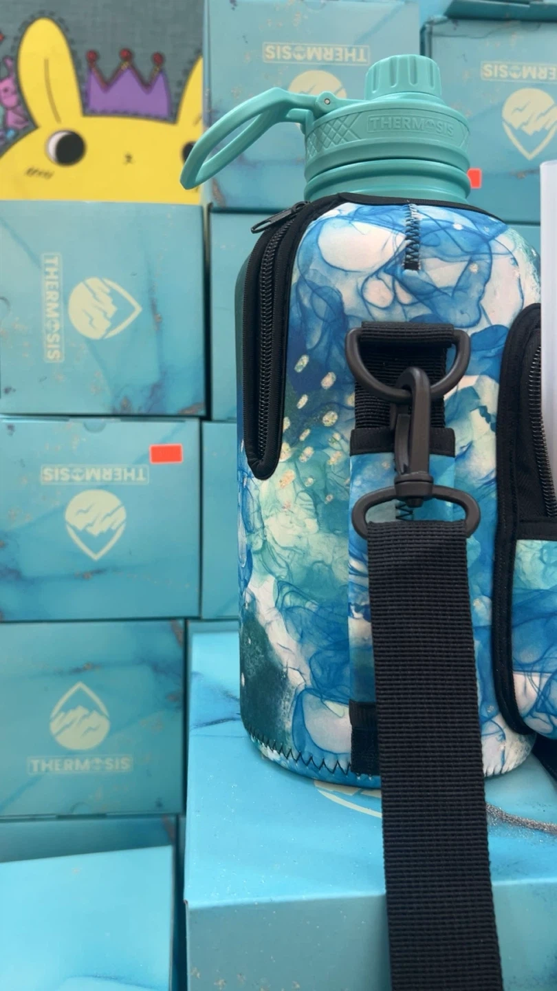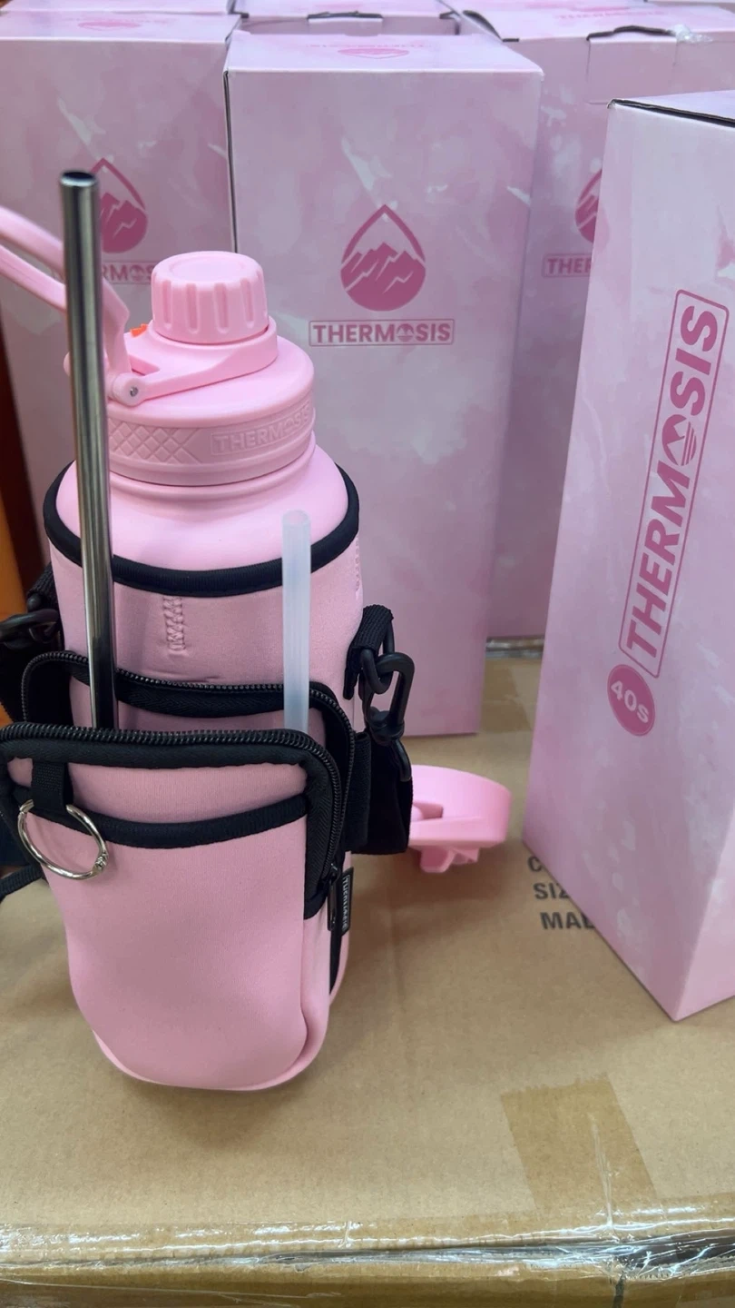 Thermosis water bottles are available in various sizes and colours, including 64oz and 40oz options. They come with a protective neoprene sleeve and an adjustable shoulder strap for easy carrying. Some models include a straw and pouch for small items.