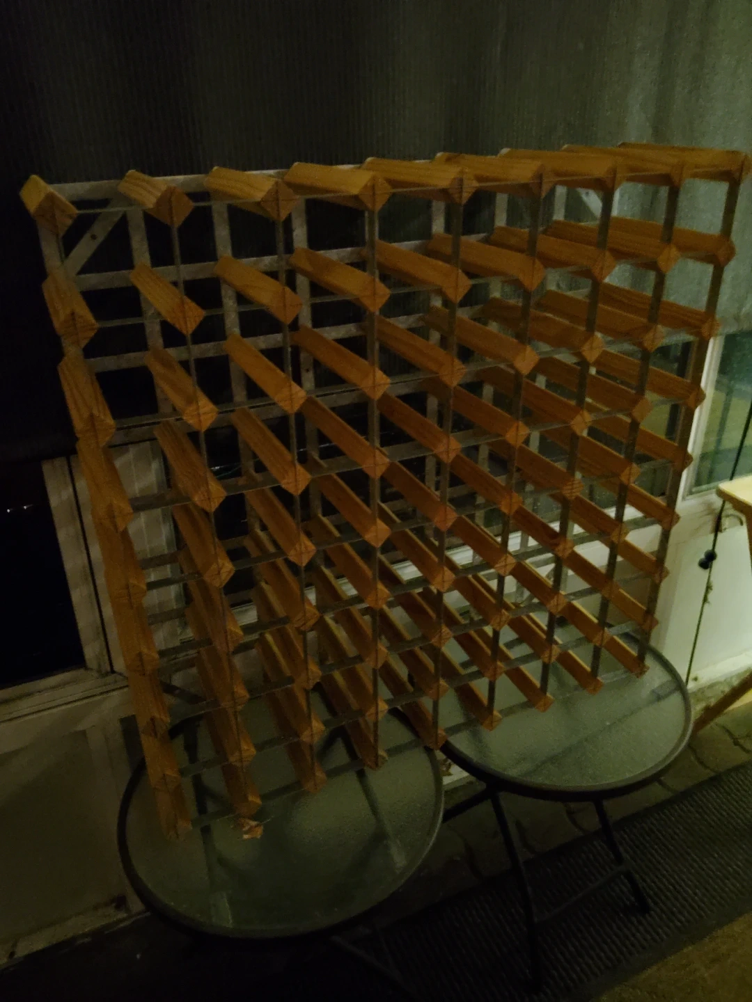 This is a wooden wine rack with a capacity for multiple bottles. It's constructed with a wood and metal frame. Suitable for home bar or cellar storage. Holds 72 bottles