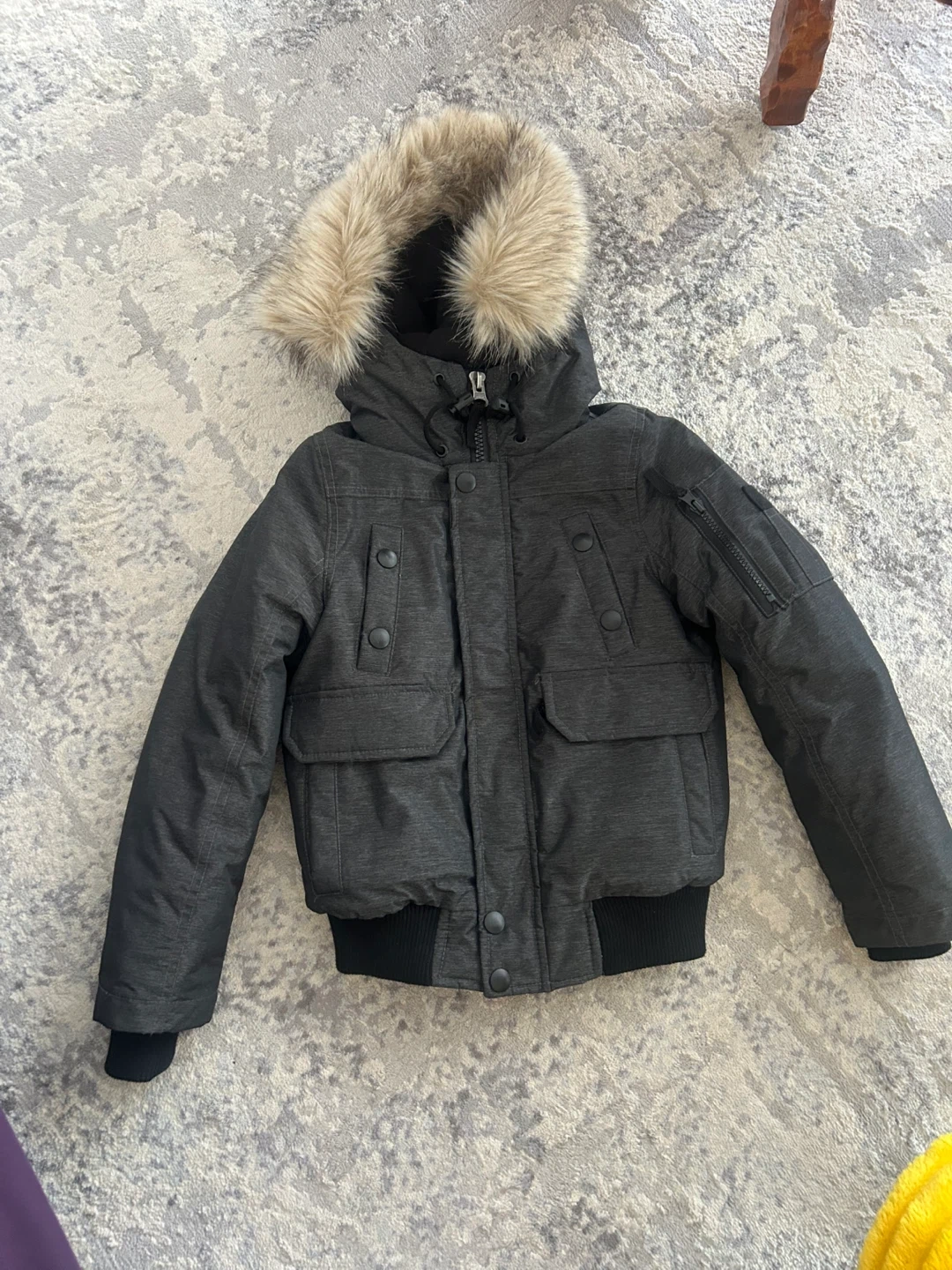 Dark grey winter parka jacket for kids. Features a cozy fur-lined hood with adjustable drawstrings. It's got ribbed cuffs and hem for extra warmth. Plenty of pockets with button and zipper closures.