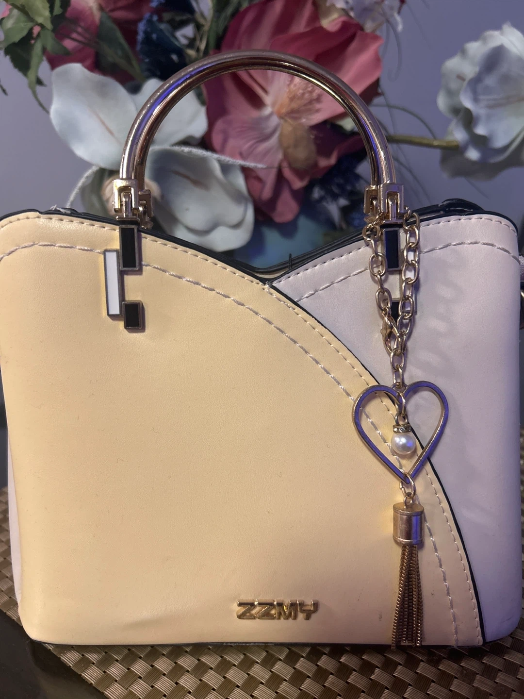 Selling a cute ZZMY satchel bag! It's a two-tone design, cream and yellow color. Has a heart-shaped charm and gold-tone hardware.