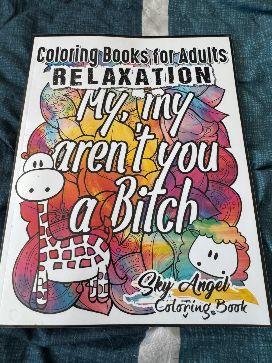 This is the Sky Angel "My, my, aren't you a Bitch" coloring book for adults. It's designed for relaxation and features fun designs. It's a great way to de-stress and unwind!