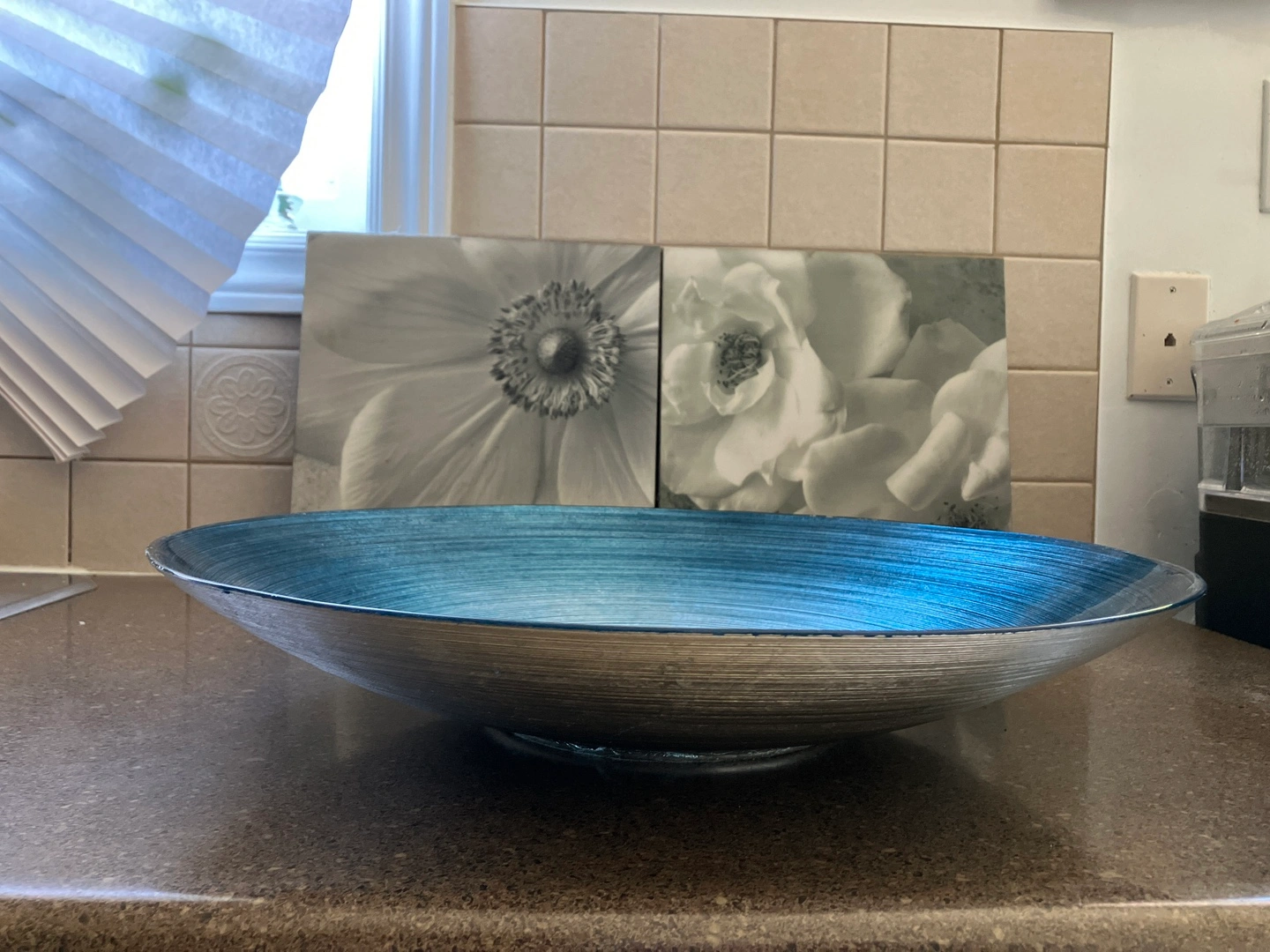 Selling a beautiful decorative bowl with a unique blue and white design! It measures approximately 18 inches in diameter, making it a great centerpiece for any table or shelf. It's in great condition and ready to add a touch of elegance to your home