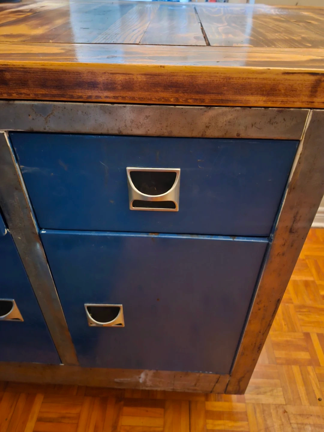 Selling a hand designed, kitchen island with a beautiful real wood top and stylish blue drawers on wheels! It's a unique piece that adds character to any kitchen. The drawers provide ample storage space, and the wood top is perfect for food preparation or casual dining. It's in great condition and ready for a new home! Also comes with an additional metal attachable metal leg in case you need xtra stability for a function. The wood top is 47" X 31", the cabinet is 31" height X 32" wide X 17" depth. The full height with the wheels is 35".